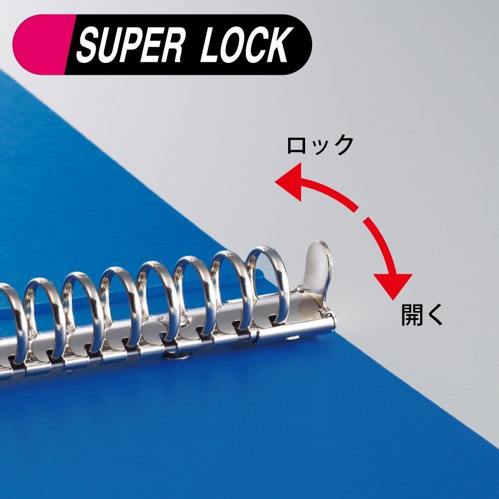 ●書類が抜け落ちないように、2段階のロック機構でとじ具の開きを押さえるスーパーロックとじ具を採用した、A4サイズ30穴のリングファイルです。