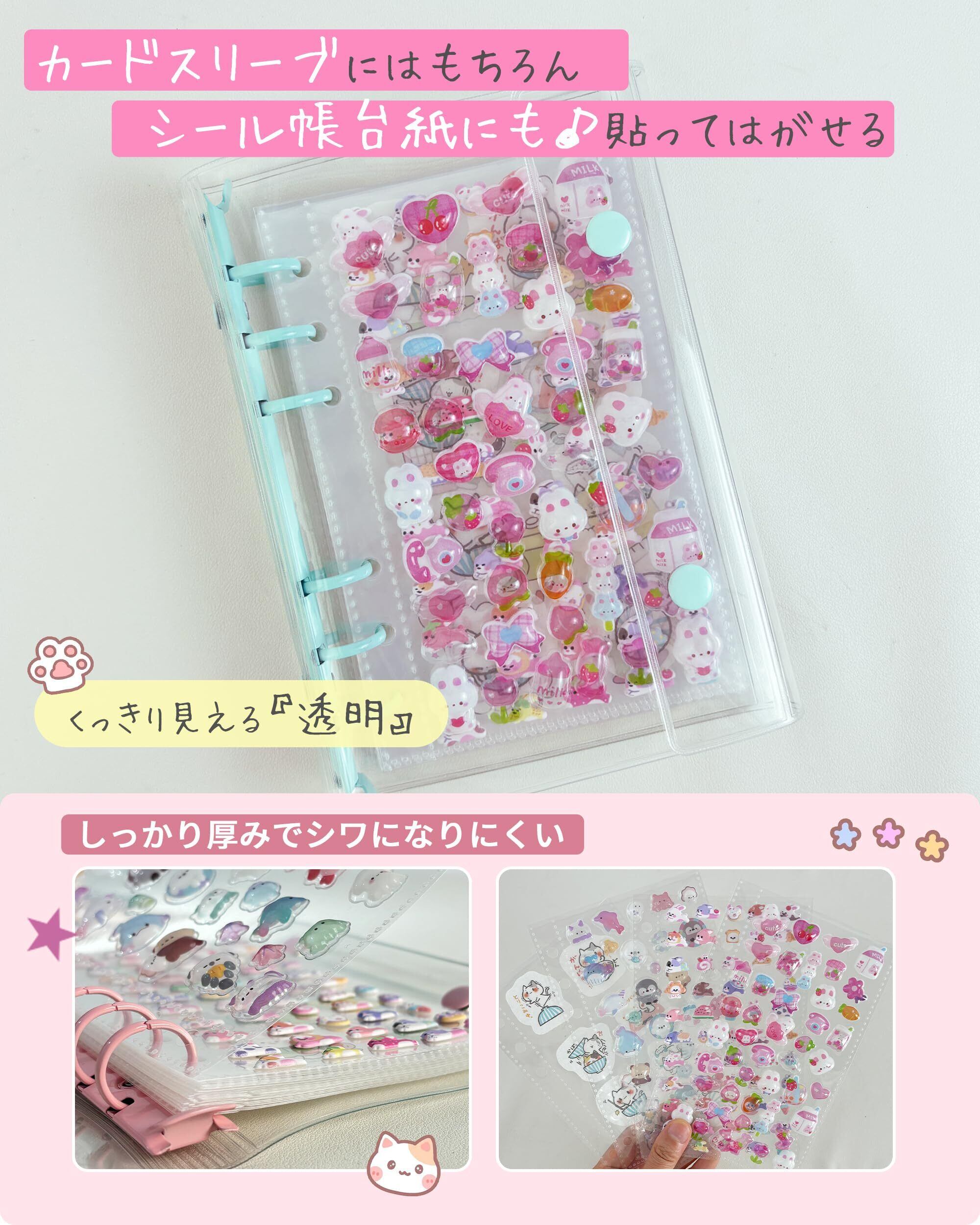 【便利な付属品・トレカやチェキがぴったい入るサイズ】 ❶カードスリーブにはもちろん、立体シールのシール帳台紙にも!シール帳台紙として、リフィルに集めたラールを貼ろう!❷下敷き表面はザラザラしていて、シールがべったり付かずに、剥がしやすい!また、文字を書くときにガタガタせずペンの運びがスムーズ。❸チャック付きのポケットには切ったシール、プリクラ、小さなはさみやピンセットなど手帳用の素材を収納便利。領収書·レシート等の保管でも活躍!※紙のリフィルは付属していません。※シールは別売りです。