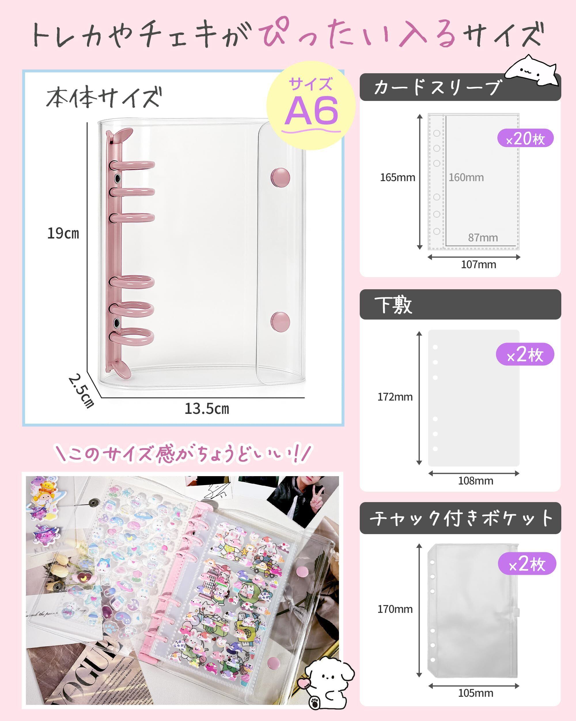 【A6サイズ シール帳バインダー】 セット内容:❶バインダー本体 ❷カードポケットリフィル(プラスチックシート)×20枚 ❸チャック付きボケット×2枚 ❹下敷き×2枚。内寸約8.8cm×16cmのカードスリーブで、各種トレカや写真をしっかり収納、バインダーに穴のないカードや写真を追加できます。本体サイズ(約):縦19㎝×横12㎝×厚み2.5㎝。