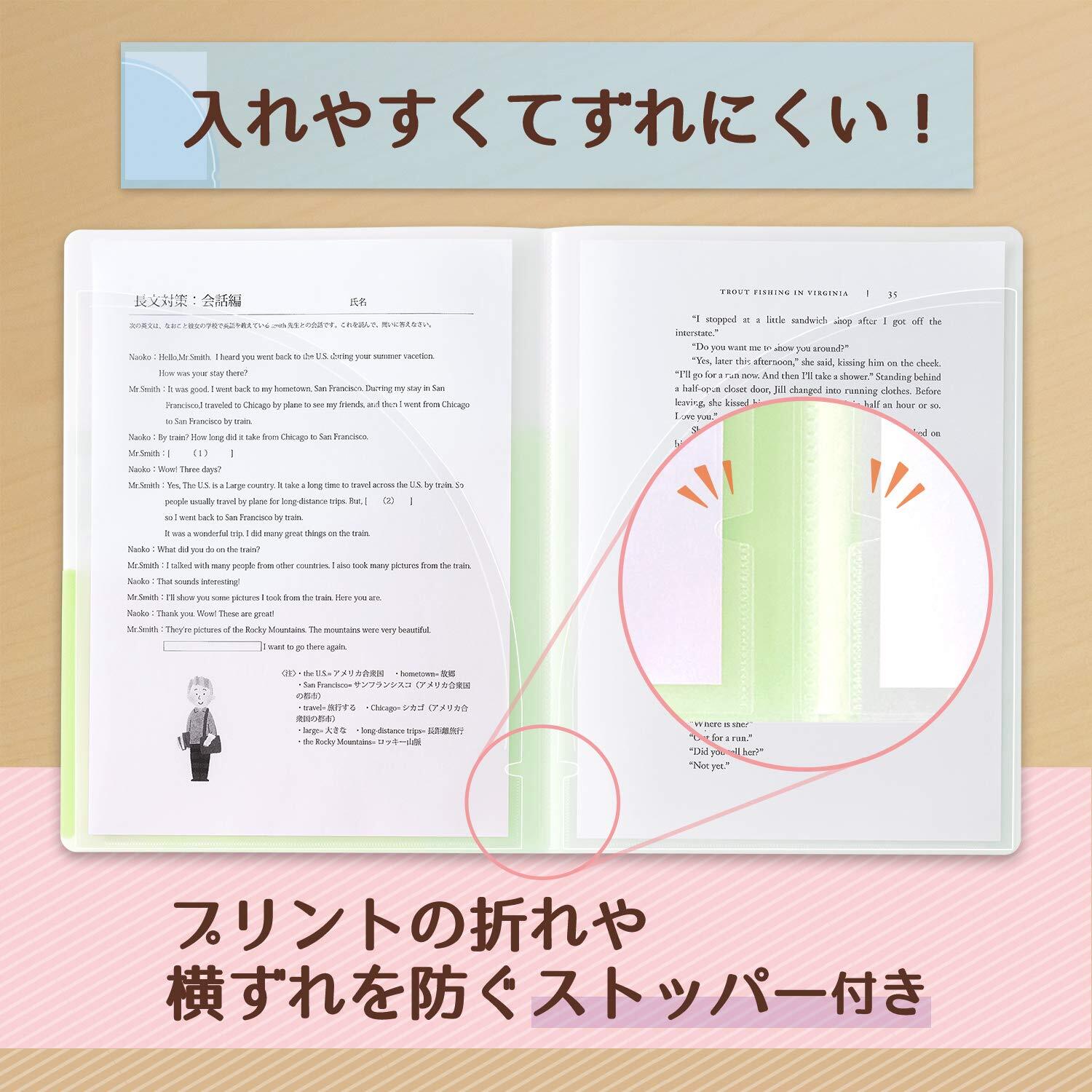 ・ファイルを綴じたとき、プリントの横ずれや折れを防ぐストッパー付きです