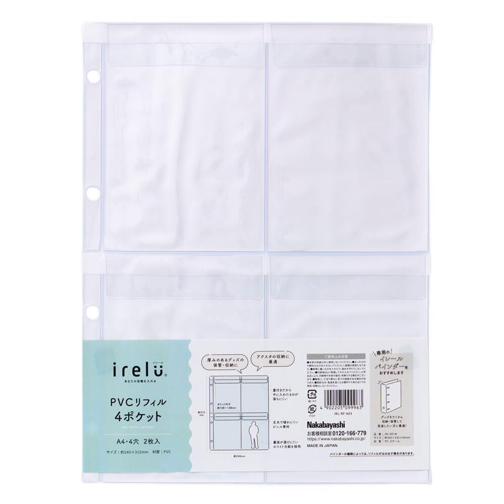 【在庫セール】【irelu】 ポストカードサイズ以内のアクスタ収納 [イレールPVCリフィル 4ポケット] A4 4穴 白台紙 蓋(フラップ)付き 飛び出し防止 IRL-RF-A03【PT1】