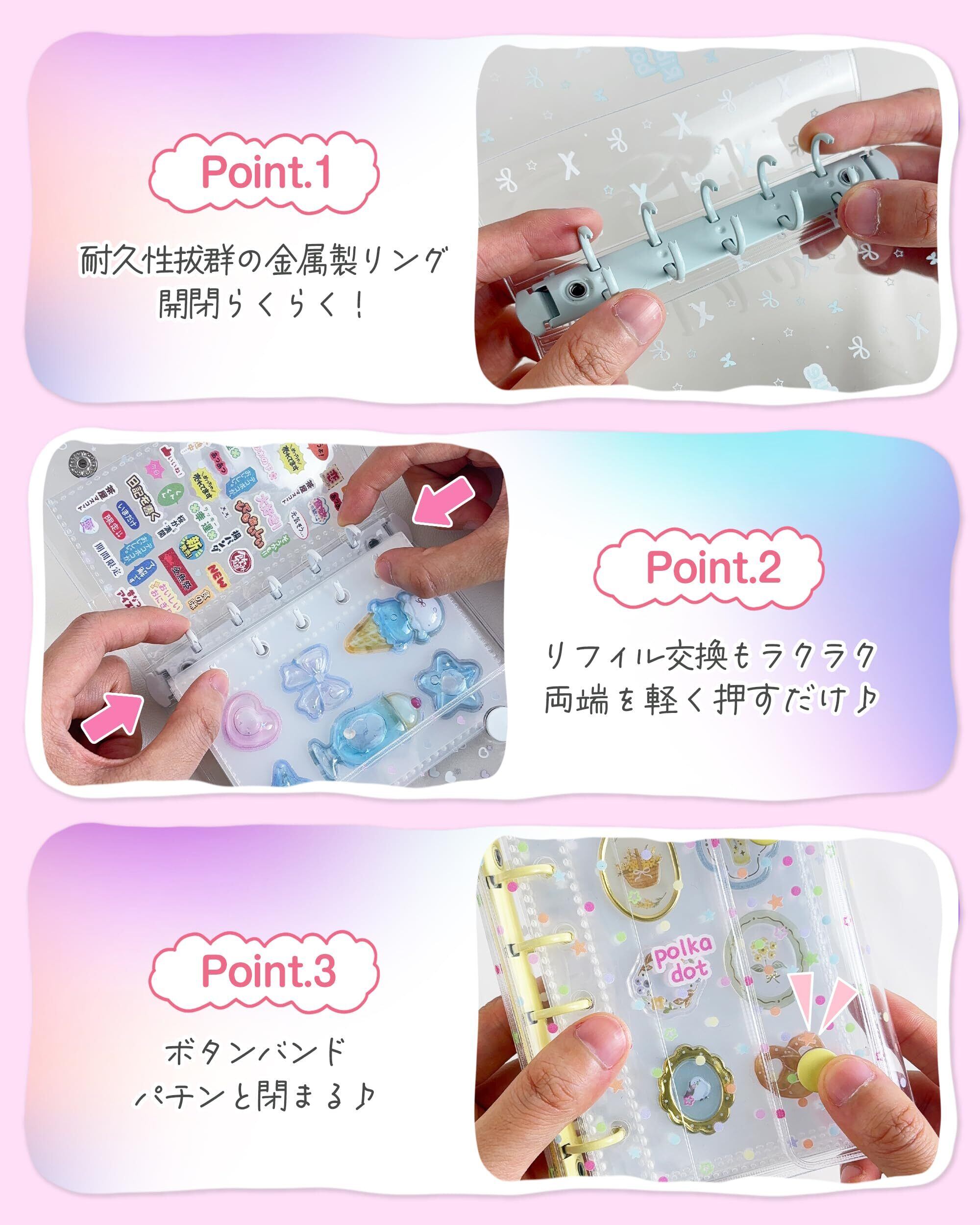 【丈夫な金属製リング・スナップボタンを採用】 金属リングは軽く押すだけで開閉でき、リフィルの出し入れが簡単。お好みに合わせて自由にカスタマイズできます。バッグの中でもスナップボタンがしっかり留まり、開く心配がありません。可愛いだけじゃなく実用的!気軽に贈れるプレゼントとしても最適です。