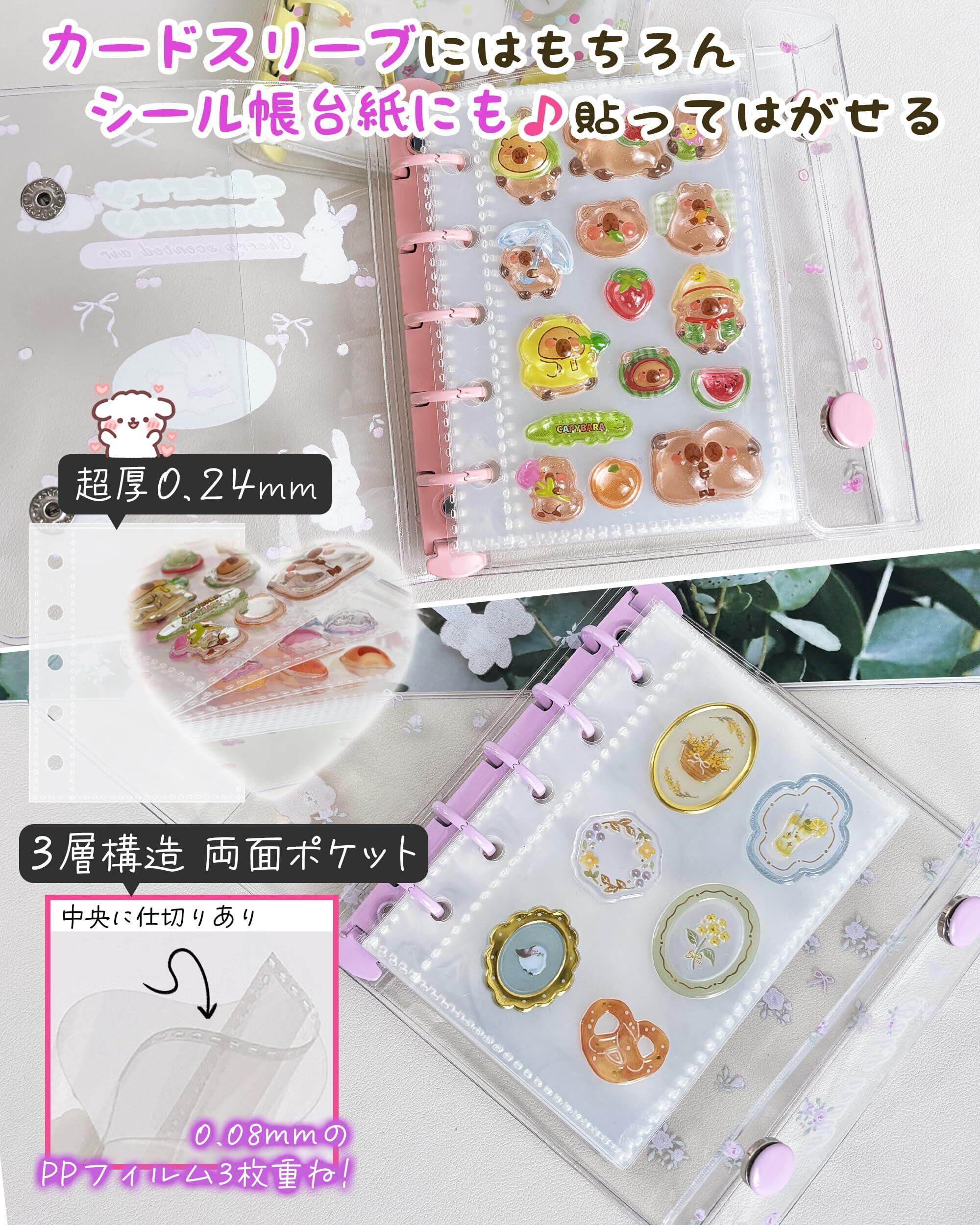 【便利な付属品・トレカやチェキがぴったい入るサイズ】 ❶カードスリーブにはもちろん、立体シールのシール帳台紙にも!推し活やシール整理がもっと楽しく、もっと便利に❷チャック付きのポケットには切ったシール、プリクラ、小さなはさみやピンセットなど手帳用の素材を収納便利。領収書·レシート等の保管でも活躍!❸下敷き(シール専用台紙)表面はザラザラしていて、シールがべったり付かずに、剥がしやすい!シール帳台紙として、リフィルに集めたラールを貼ろう!また、文字を書くときにガタガタせずペンの運びがスムーズ。