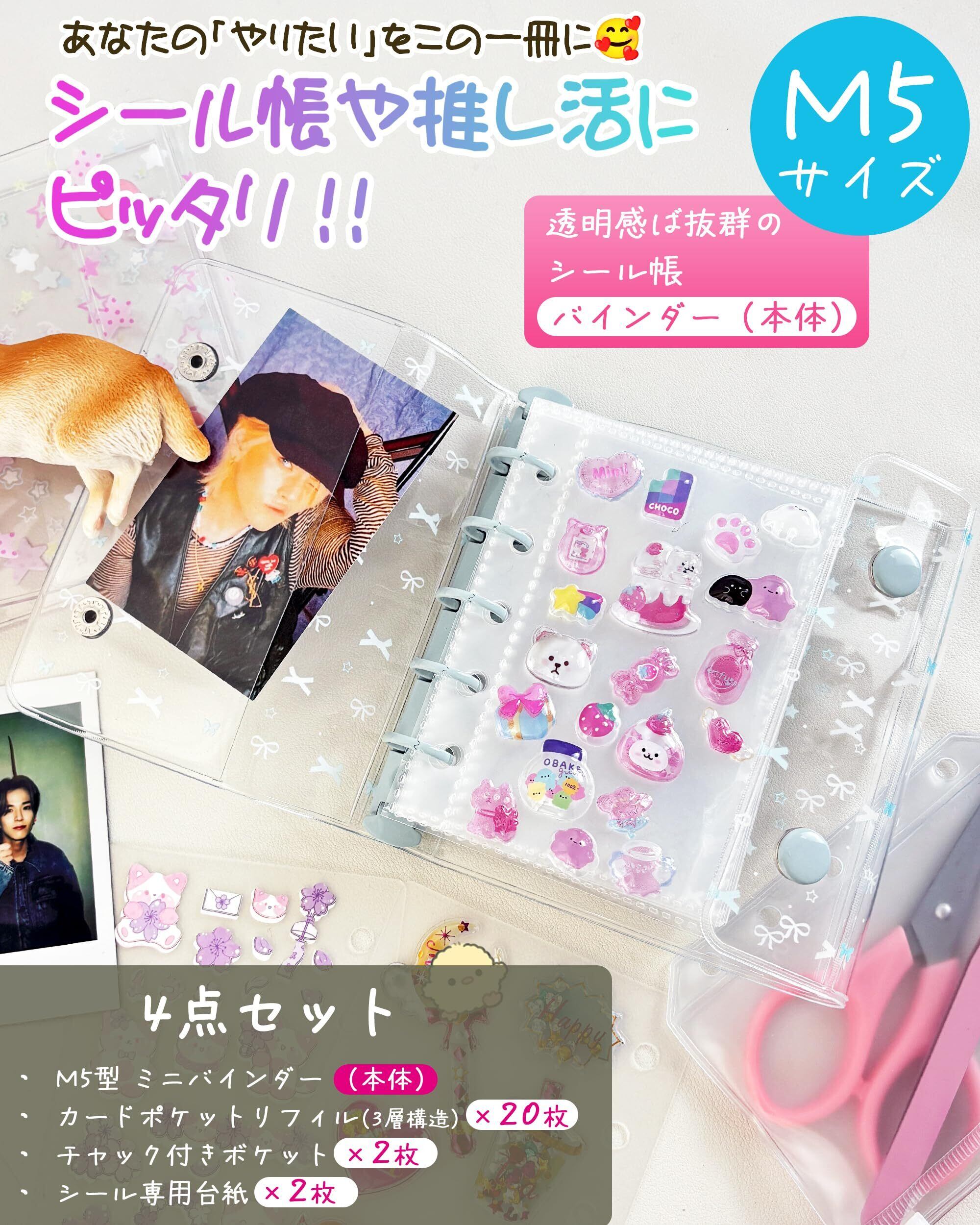 【M5サイズ シール帳バインダーのセット内容】 セット内容:❶バインダー本体 ❷カードポケットリフィル(3層構造/プラスチックシート)×20枚 ❸チャック付きボケット×2枚 ❹下敷き(シール専用台紙)×2枚。内寸約6.3cm×10.5cmのカードスリーブで、各種トレカや写真をしっかり収納、バインダーに穴のないカードや写真を追加できます。本体サイズ(約):縦12.5㎝×横10.5㎝×厚み2.5㎝。※シールは別売りです。