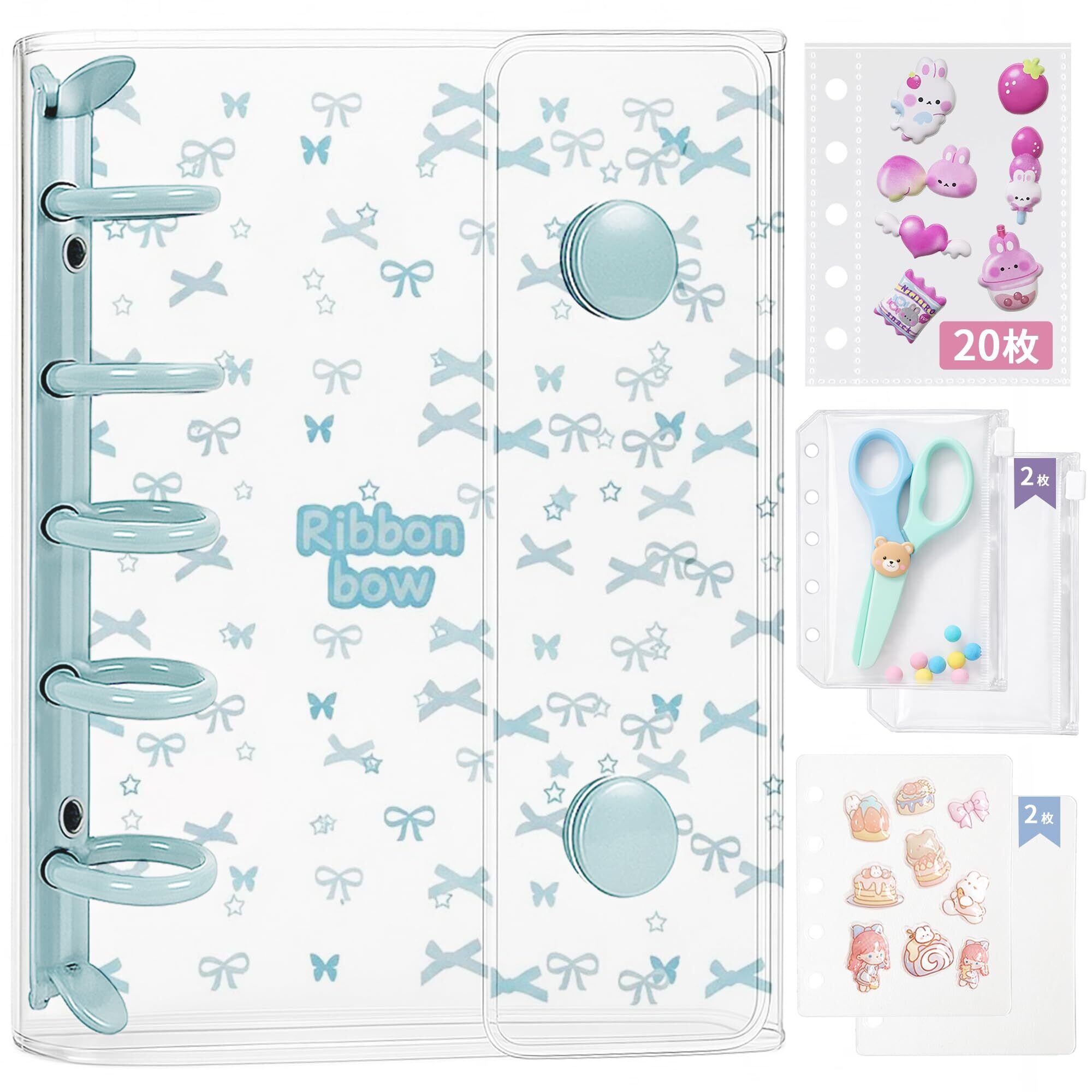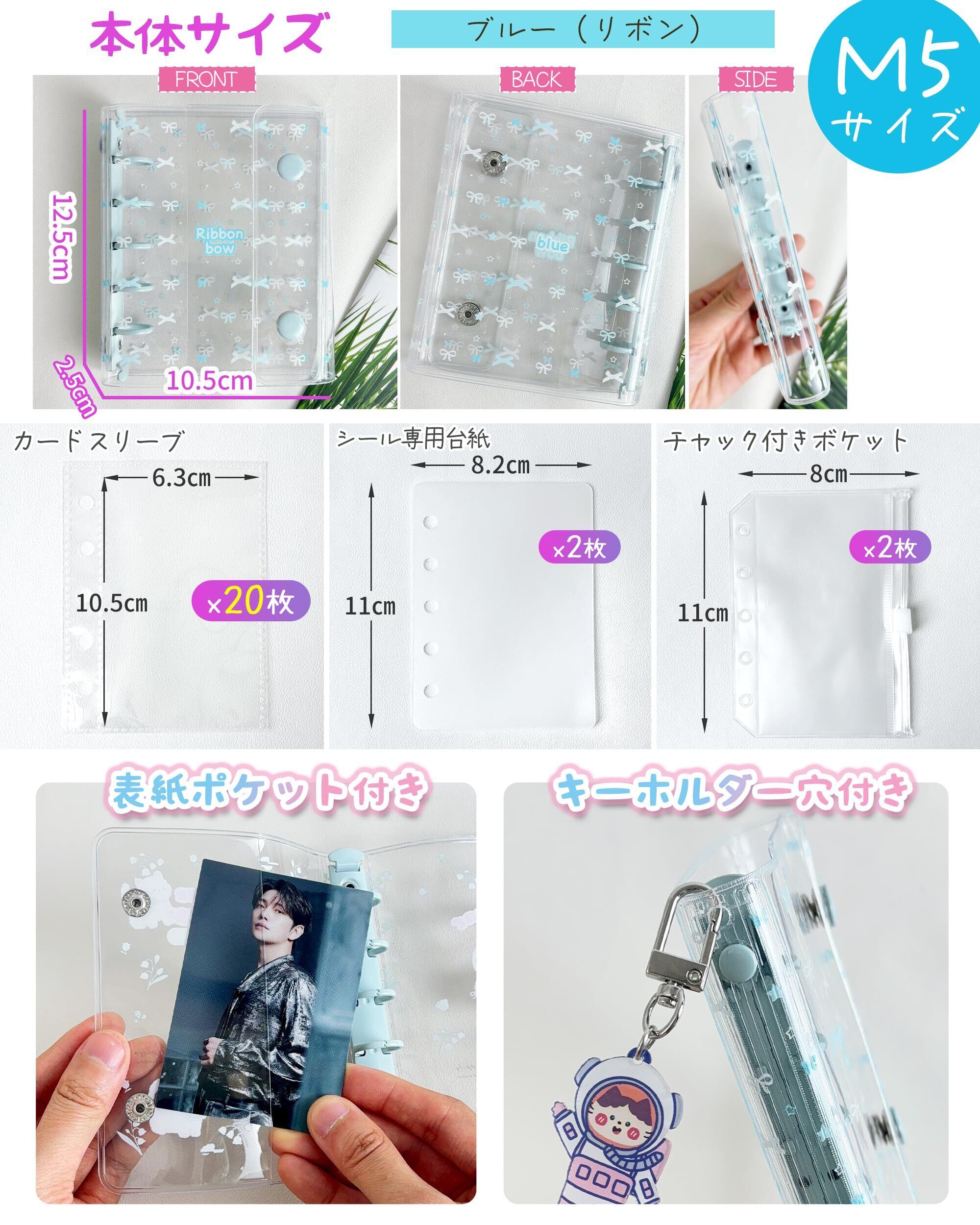 シール帳 M5サイズ 【バインダー本体 リフィル×20枚 チャック付きボケット×2枚 シール専用台紙×2枚】 プラバン 透明 ミニ クリアバインダー 3層構造PPシート カードポケット シール台紙 手帳 プリ帳 女の子 ブルー(リボン)