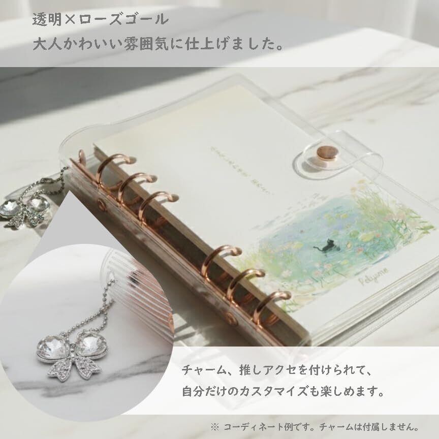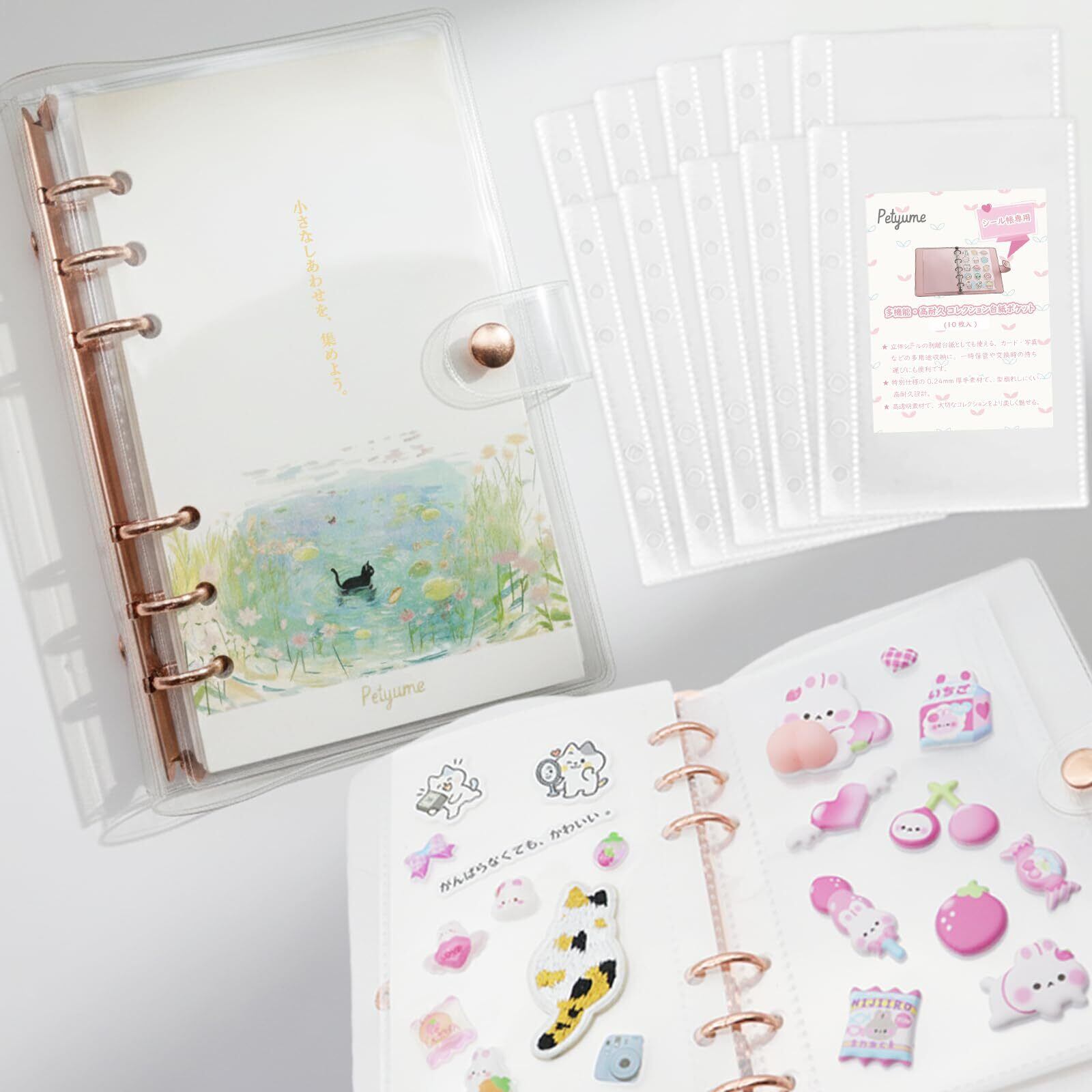 透明クリアカバーとローズゴールド金具を組み合わせた、 上品で“大人かわいい”デザインのA6シール帳です。 癒しの猫イラスト入りインナーカバー付きで、 ノートを開くたびに心が和らぐ一冊に仕上げました。 A6サイズ・6穴バインダー仕様のため、 シール台紙・トレカ・写真など、 お好みのリフィルを自由に追加・入れ替え可能です。 側面にはチャームやキーホルダーを取り付けられる金具付き。 推し活やデコレーションも、自分らしく楽しめます。 厚手のPVCカバーを使用し、防水・防汚仕様。 軽量ながら大容量で、最大約100枚の台紙を収納可能です。 可愛さと実用性を両立した、 毎日の「好き」を大切に集められるシールバインダーです。