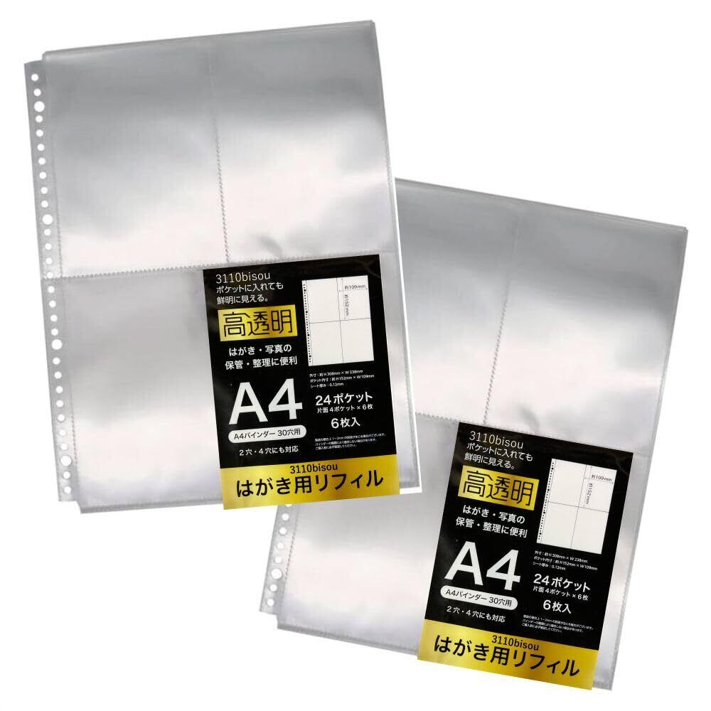 【2022最新】ポケットに入れてもハガキ・写真が鮮明に見える!! A4 バインダー はがき用リフィル 30穴 (片面4ポケット×6枚 合計24ポケット) 差替式ポケットファイル (まとめ買い2パック)