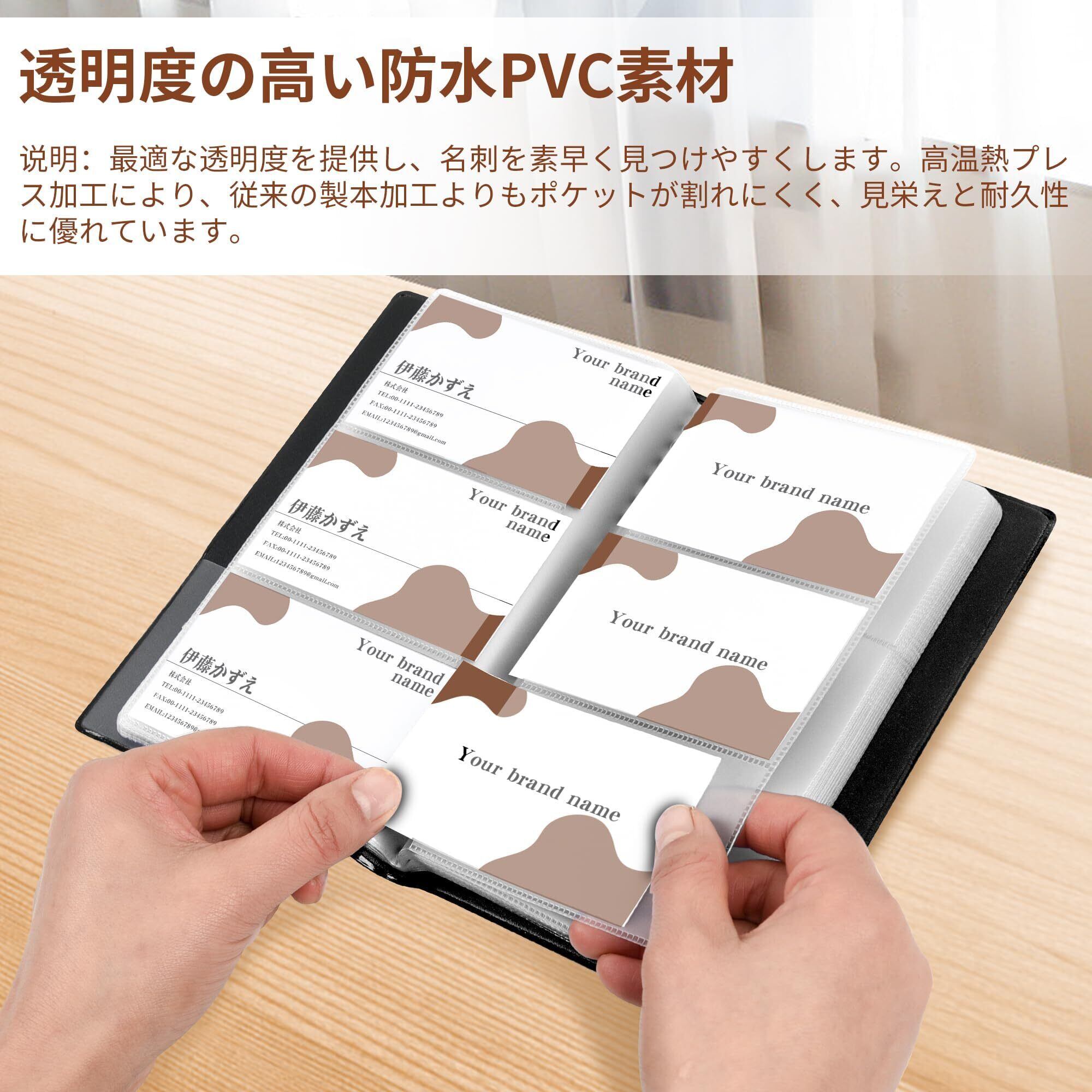 高品質素材:名刺ホルダーのカバーは高品質なPUレザーを採用し、耐摩耗性に優れ、変形しにくく、軽い汚れはサッと,ビジネスや日常使いに最適です。内側のカード用透明ポケットは半透明のPVC素材でできており、縁には高温のホットプレス加工を施し、従来の綴じ方に比べて日常使用での磨耗や破れが少なく、素材は滑らかでベタつかず、表裏がはっきり見えるので、カードの位置や出し入れが簡単です