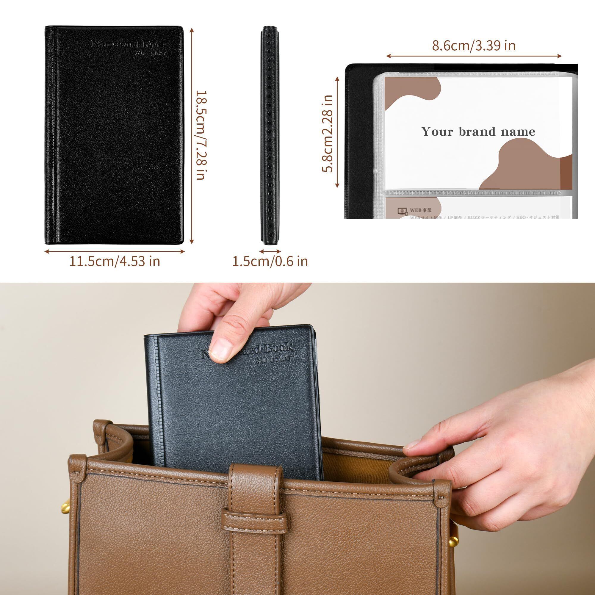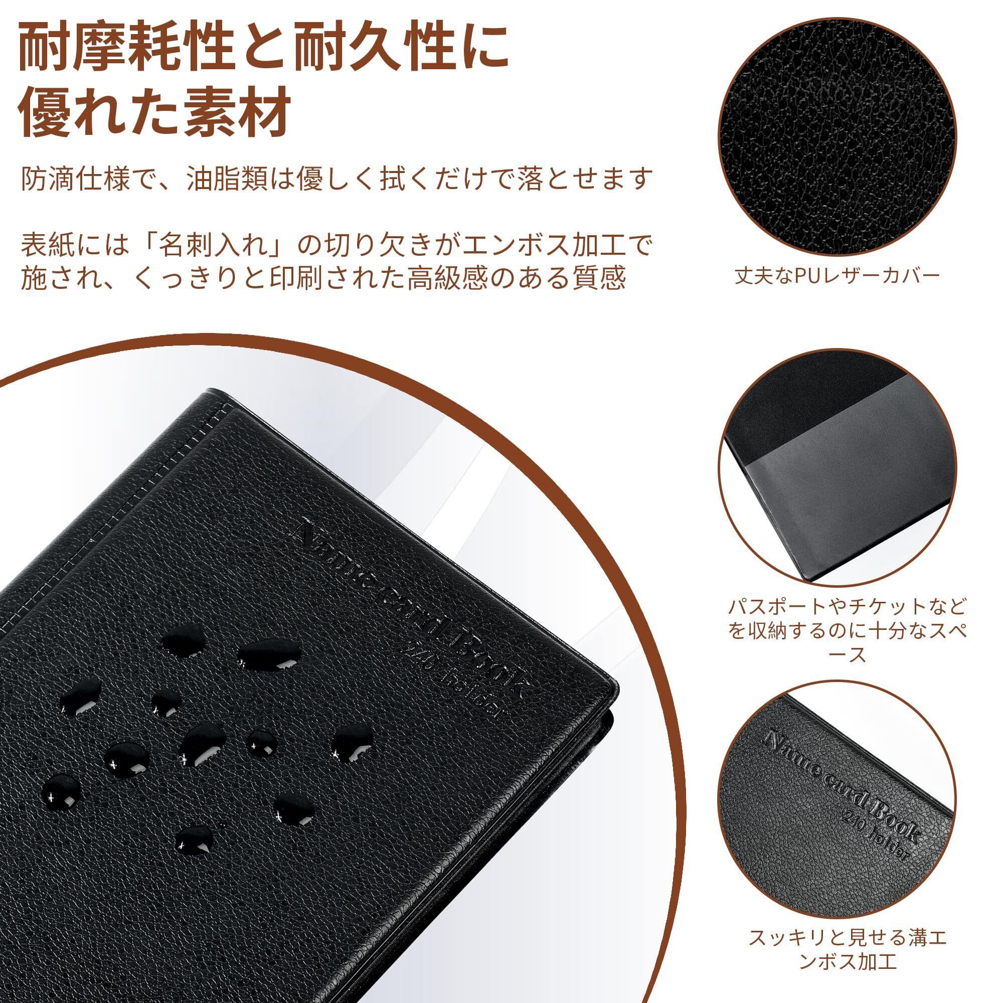 抜群の大容量,これは名刺ホルダー 大容量,240枚の名刺が収納可能:名刺入れは片面3ポケット、計40ページなので、各ポケットに名刺を2枚ずつ入れれば、(カードの厚さにより異なります)、最大240枚の名刺を収納できる。 大量の名刺を一元管理できる。また.表紙左内側にはクリア収納ポケットもあり、パスポー ト切符やレシートなど の小物を収納できる