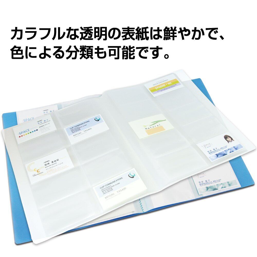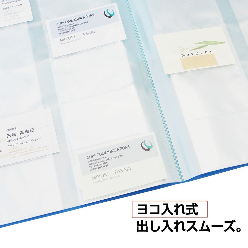 A4サイズで名刺を整理。見開きで20枚の名刺が見られる。