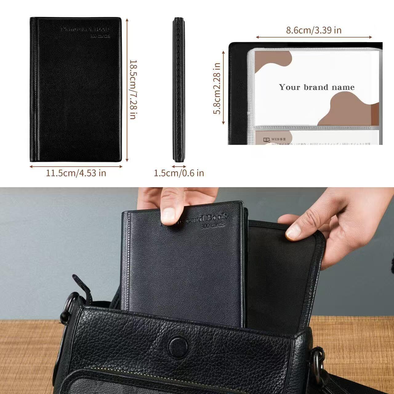 抜群の大容量,これは名刺ホルダー 大容量,300枚の名刺が収納可能:名刺入れは片面3ポケット、計50ページなので、各ポケットに名刺を2枚ずつ入れれば、(カードの厚さにより異なります)、最大300枚の名刺を収納できる。 大量の名刺を一元管理できる。また.表紙左内側にはクリア収納ポケットもあり、パスポー ト切符やレシートなど の小物を収納できる