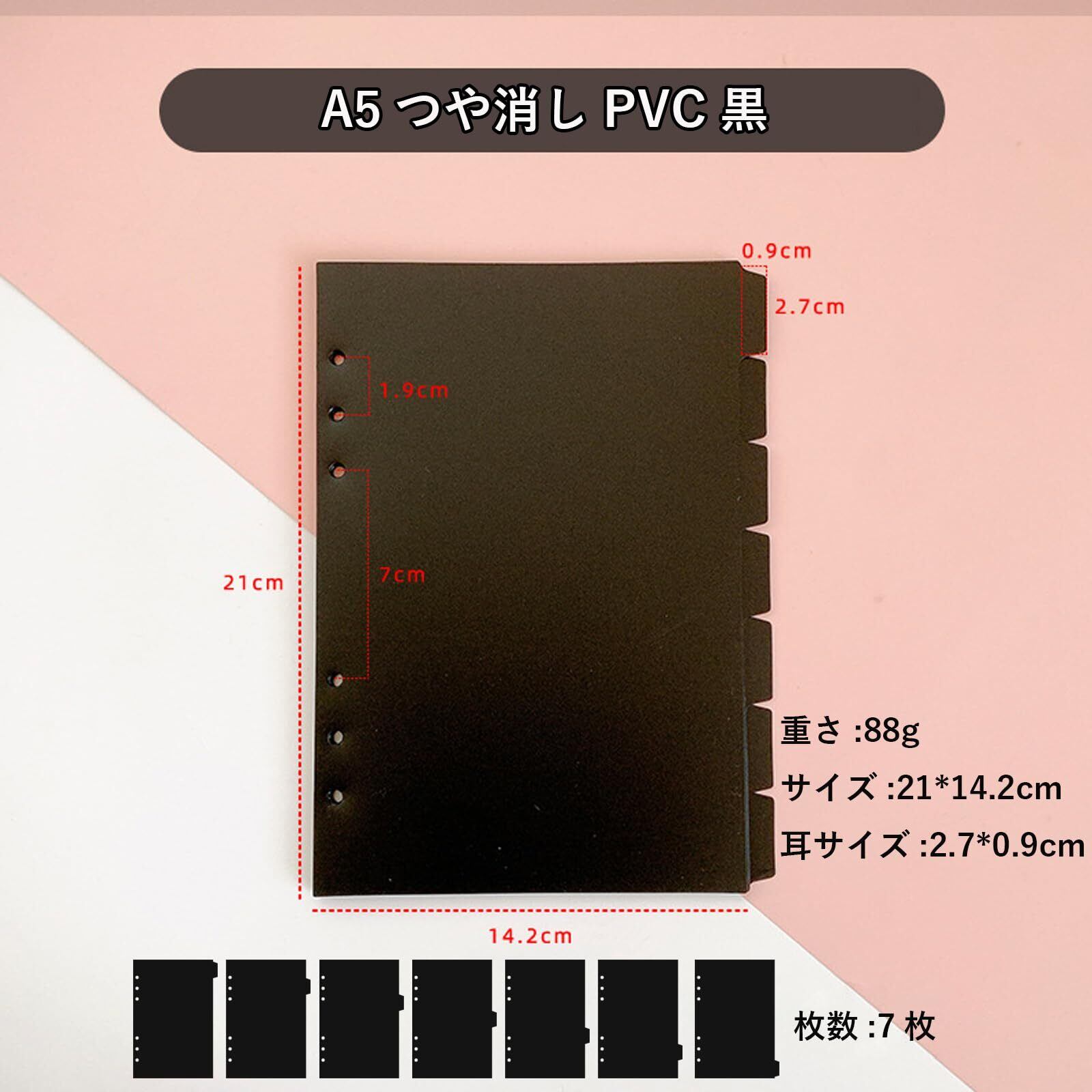 1.【インデックスシート A5 セット】:A5 仕切カード7枚セット、6穴対応、素材:pp製、カラー:黒、重量:約88g。手動測定による約210x142mmのサイズ。A5サイズで文書の管理に最適なインデックスシート。7枚入りで分類整理が格段に効率化。ご購入前に自分のバインダーのサイズを測ってください。