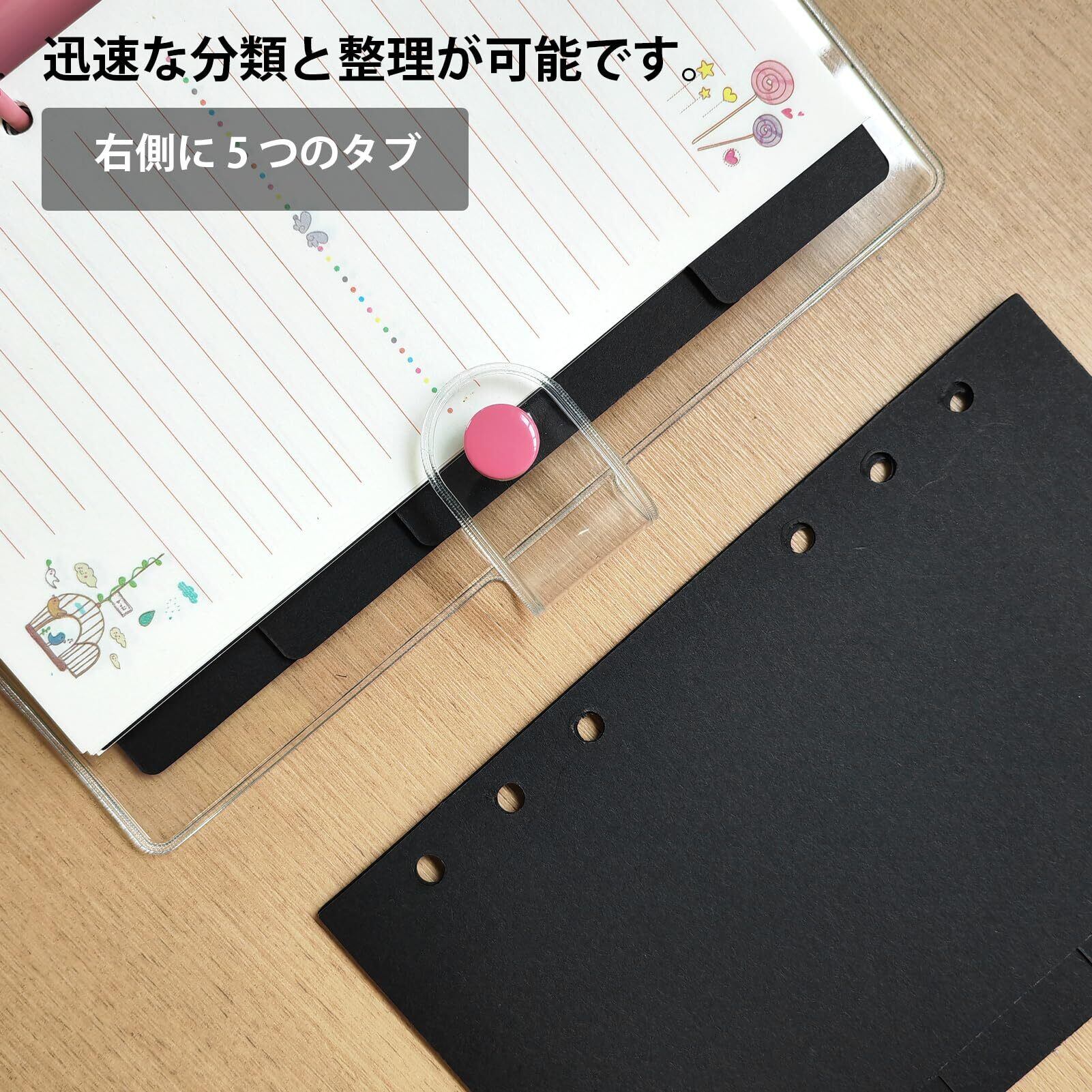 【ビジネスシーンに最適な5山設計】A6サイズのインデックスカード5山構成で、契約書の優先順位管理や案件別ファイル整理に最適。6穴バインダーにスムーズに装着可能なユニバーサルデザイン。シンプルな黒色が机の上をすっきり見せます。