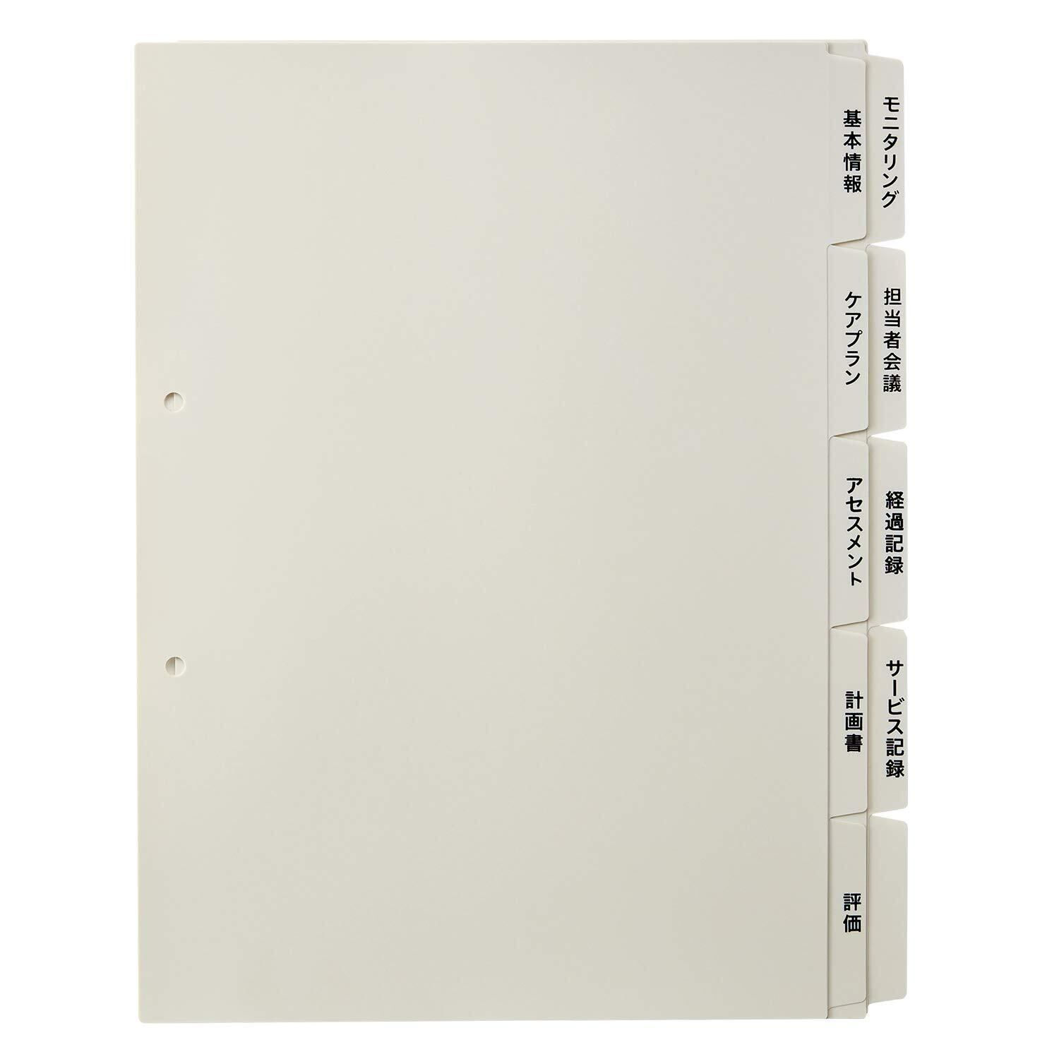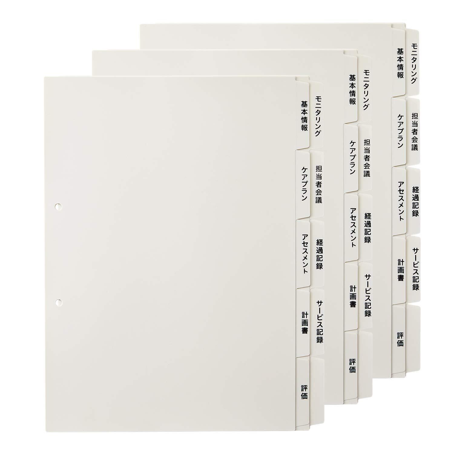 【穴間隔】80mm 【穴数】2穴用 【印刷済みインデックス名】「基本情報」「ケアプラン」「アセスメント」「計画書」「評価」「モニタリング」「担当者会議」「経過記録」「サービス記録」・無地(印刷なし)