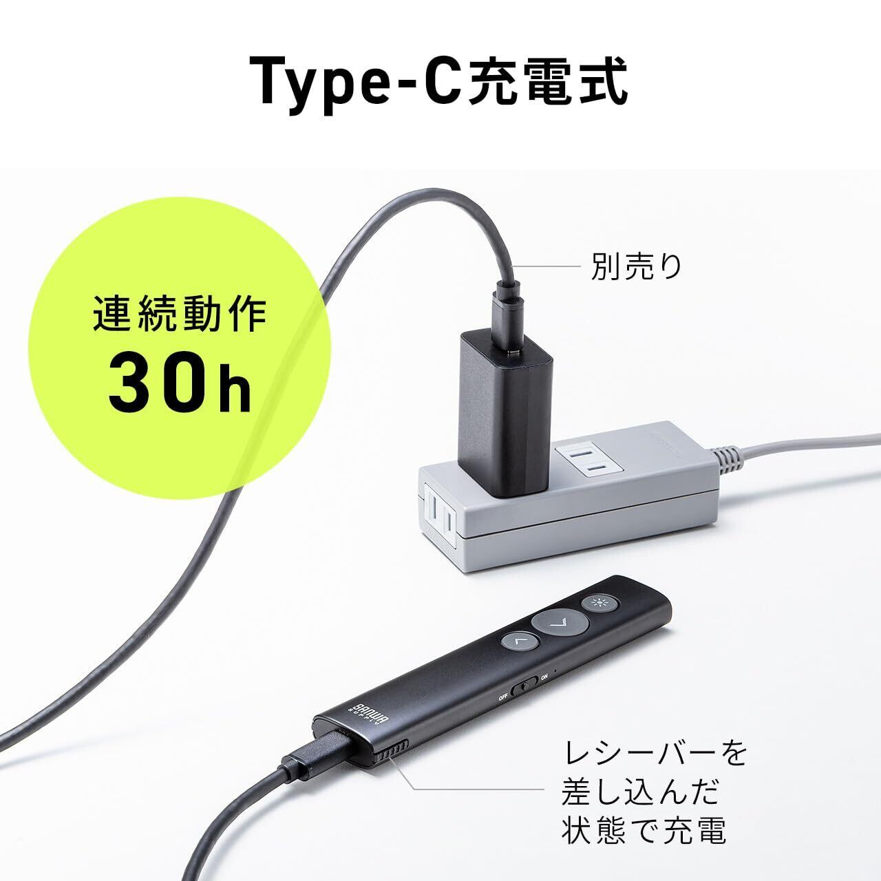 ポインターボタンを長押しすることでパソコン画面上にポインターを表示します。本体を傾けるとポインターの移動が可能です。面倒な乾電池交換が不要な USB 充電式 です。 Type-C ケーブルで 充電 することができます。プレゼンの直前までパソコンのUSBポートから充電できるので、常にフル充電で備えておけます。連続照射時間が約30時間と、長時間使用することができます。