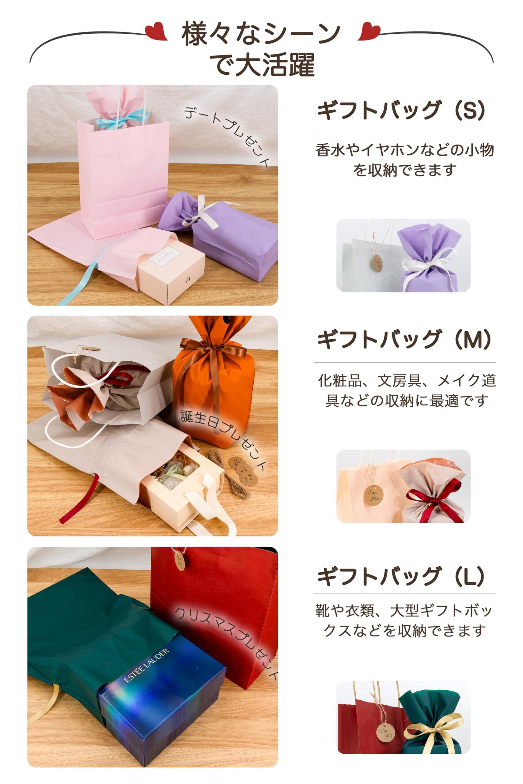 【セット内容】セットをご用意しております。Lセット:3枚ラッピング袋(3色):高さ31*幅43㎝、3枚紙袋(3色):26*12*33cm。Mセット:5枚ラッピング袋(5色):高さ24*幅36㎝、5枚紙袋(5色): 21*11*27cm。Sセット:6枚ラッピング袋(6色):高さ17*幅28㎝、6枚紙袋(6色): 15*8*21cm。S+M+Lセット:1枚Lサイズ(ラッピング袋+紙袋:1色)、1枚Mサイズ(ラッピング袋+紙袋:1色)、1枚Sサイズ(ラッピング袋+紙袋:1色)