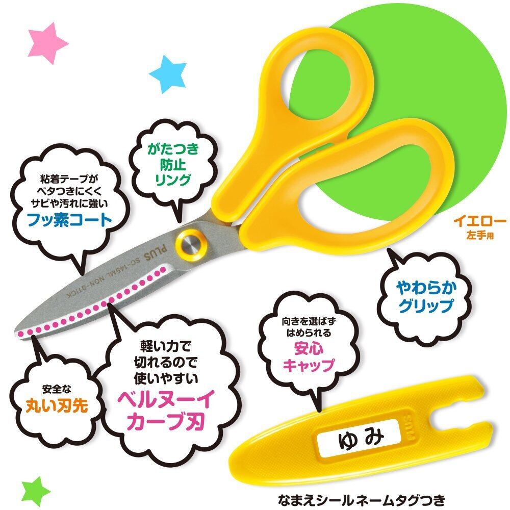 プラス はさみ左手用 フィットカットカーブ Jr ジュニア こども用 フッ素コート 粘着テープ のり ベタつかない SC-145ML 黄 34-673