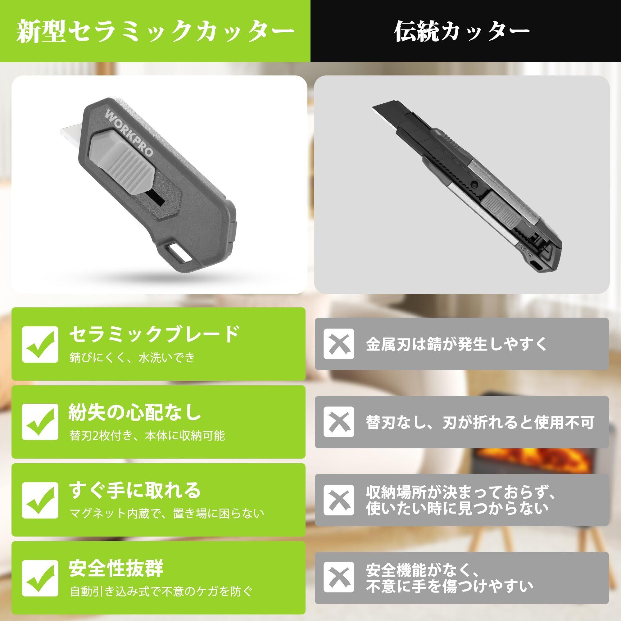 WORKPRO セラミックカッター ダンボールカッター マグネット式 安全設計 自動引き込み設計 左利き対応 コンパクト ミニ カッターナイフ 段ボール開梱 封筒・宅配袋・ペーパー用 業務用/家庭用 【セラミック刃2枚付き】 グレー