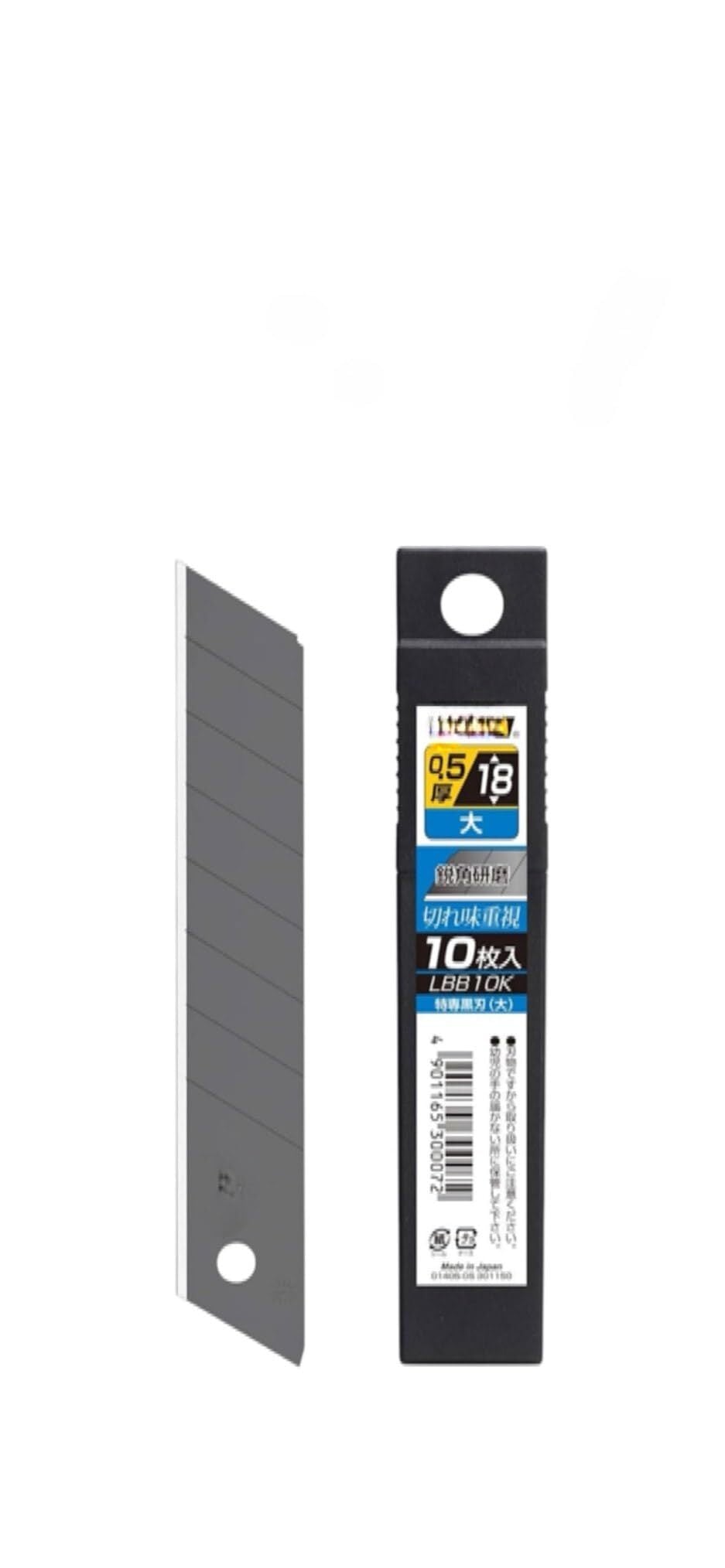 大型カッターナイフ用の、鋭角研磨で切れ味を重視した特専黒刃 プラケース包装の10枚入り 適合本体:大型刃カッター各種 梱包サイズ:13.3×2.5×1.2cm