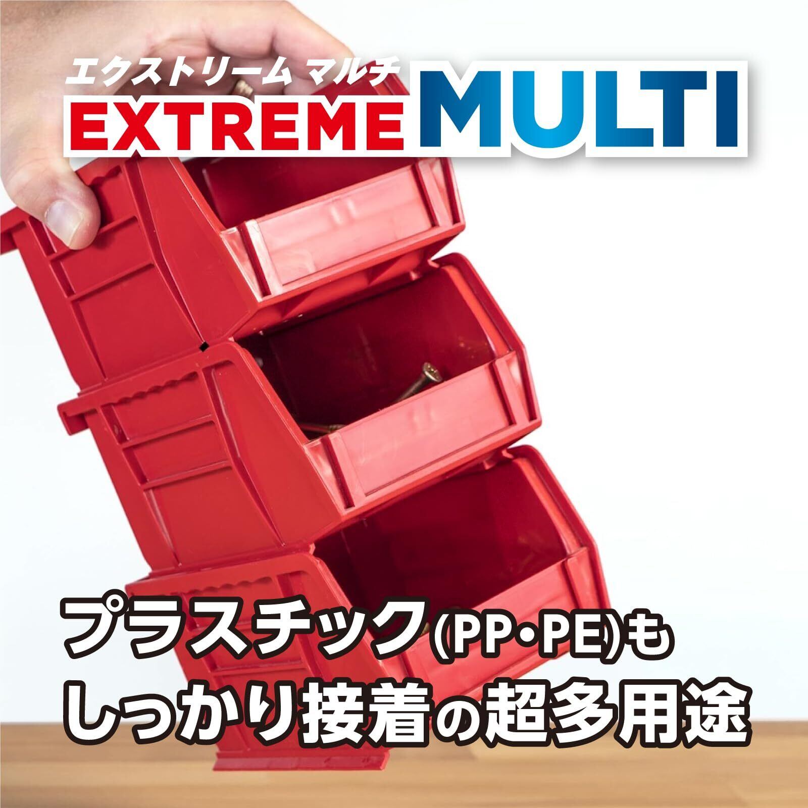 エクストリーム マルチは、一般の瞬間接着剤では接着しにくいポリプロピレン(PP)やポリエチレン(PE)などのプラスチックにも接着が可能です。