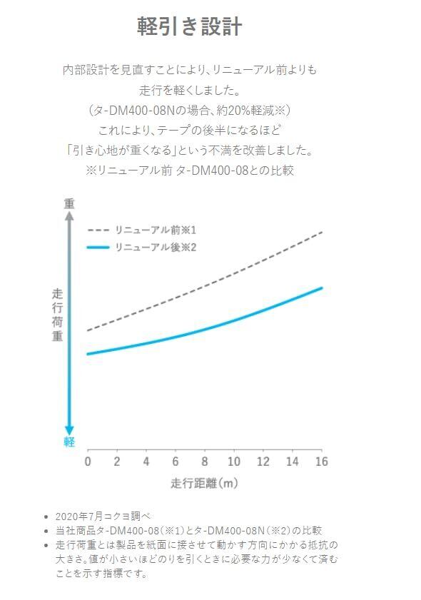 テープの後半になるほど引き心地が重くなる不満を改善した軽引き設計