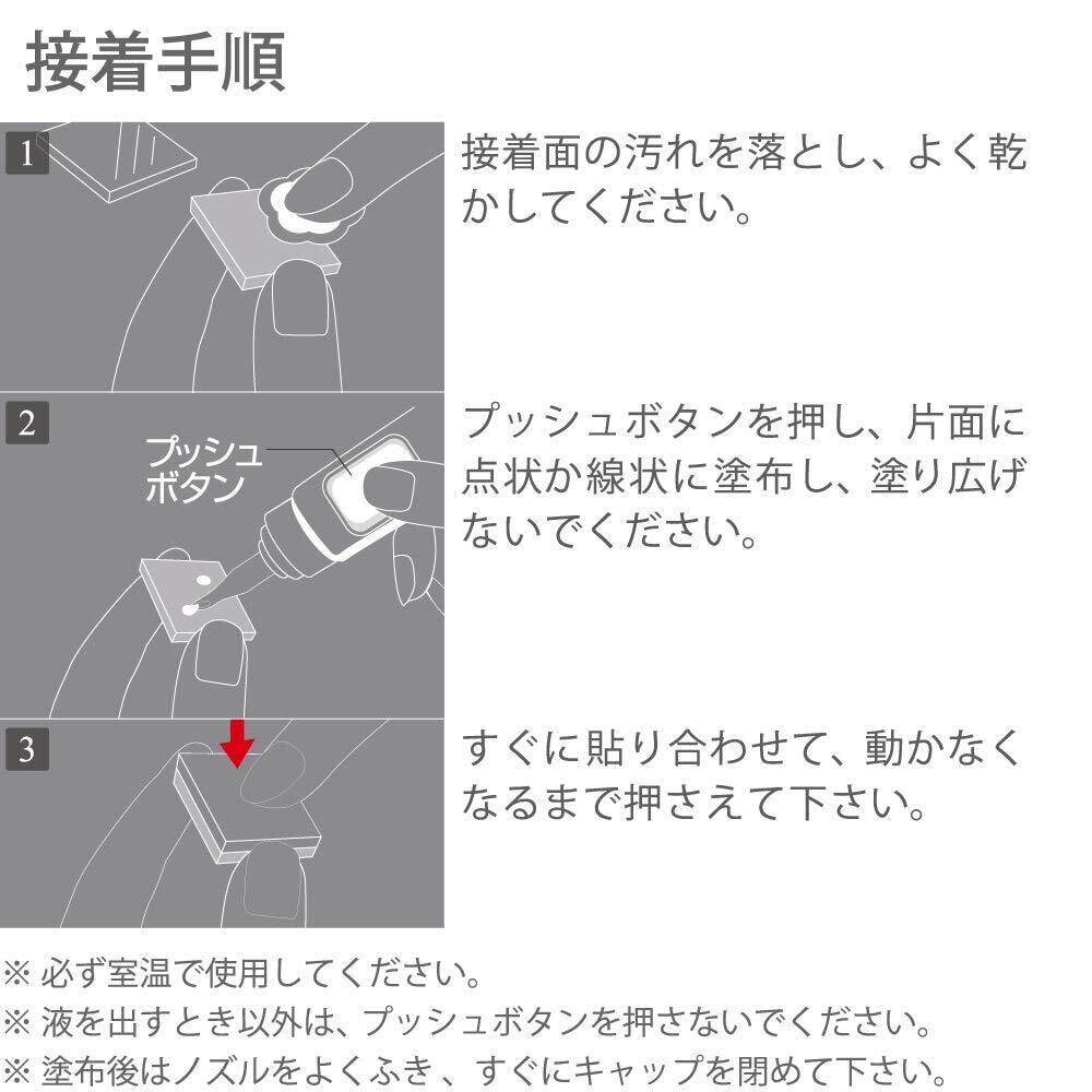 ※ポリエチレン・ポリプロピレン・シリコーン樹脂・フッ素樹脂・PET樹脂・ガラス・発泡スチロールには接着できません。