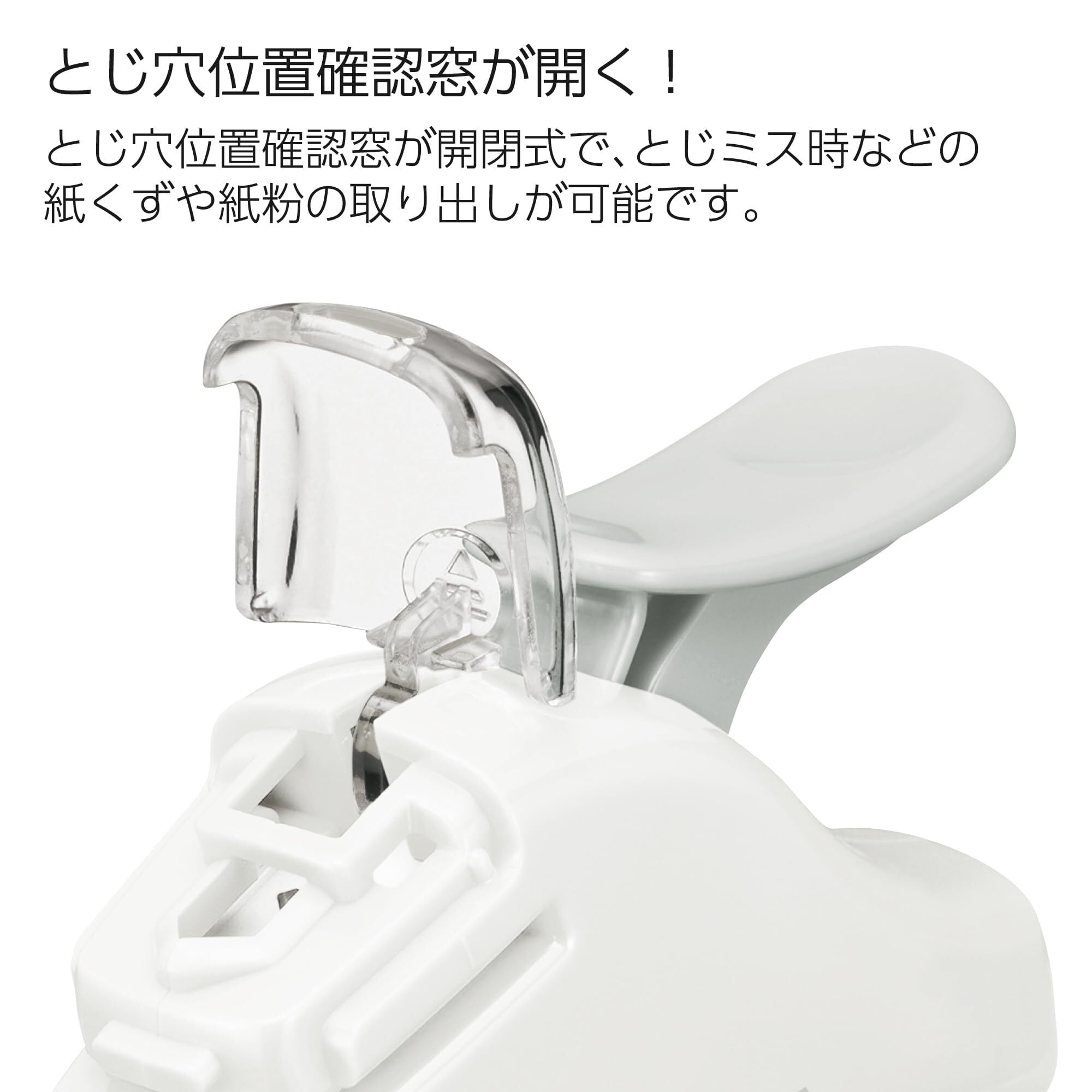とじ穴位置確認窓が開閉式なので、とじミス時などの紙くずや紙粉を簡単に取り出せます。
