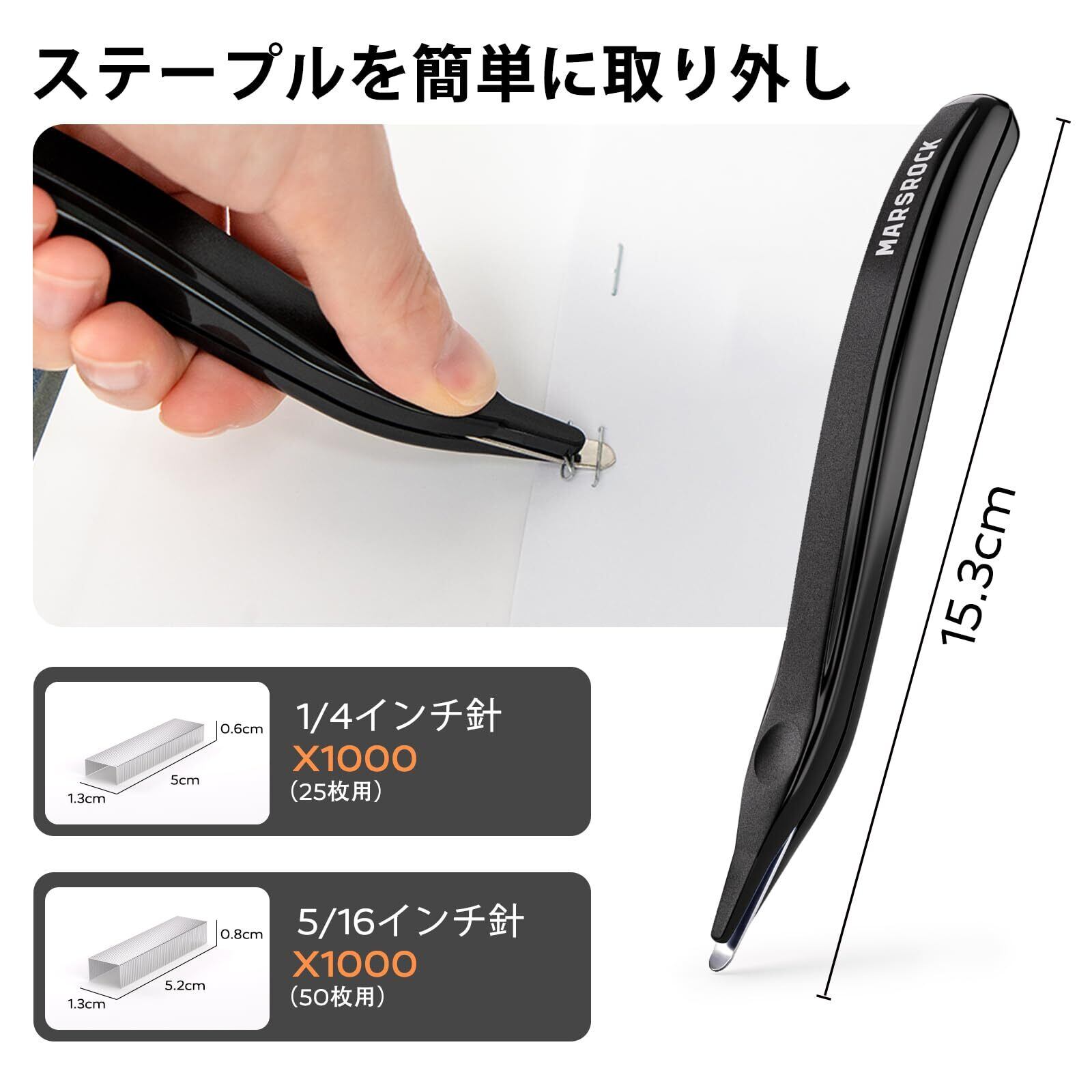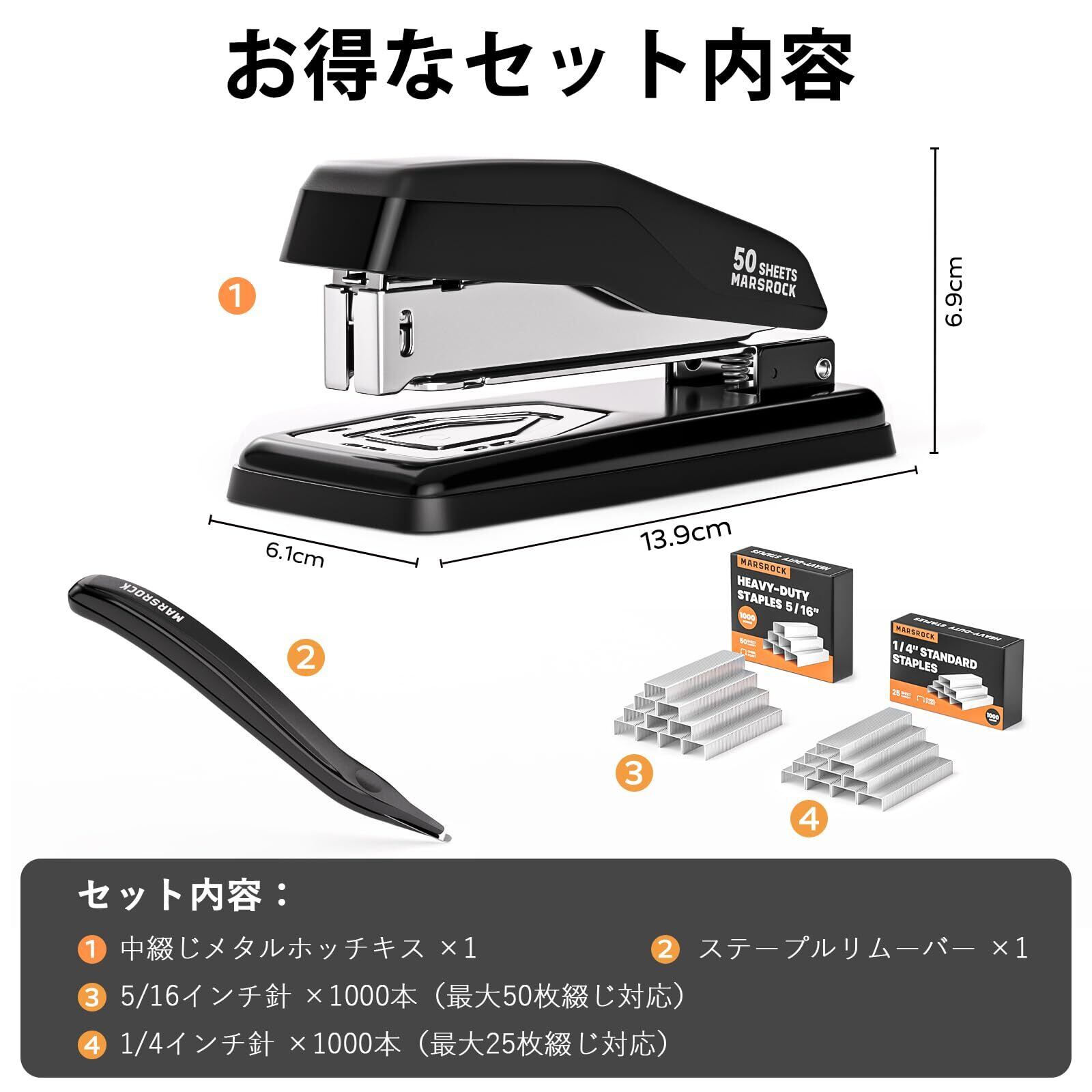 【50枚までしっかり綴じる高性能ホチキス】 忙しいオフィスで効率を求めるなら、大容量対応のホチキスが必須。Marsrockの卓上ホッチキスは、70gsmの用紙と5/16インチ(約8mm)のステープルを使用することで、最大50枚まで一度に綴じることができます。綴じ直しの手間を省き、オフィスや学校、ご家庭などでのヘビーユースに最適です。※ご使用時はしっかり奥まで押し込んでください。