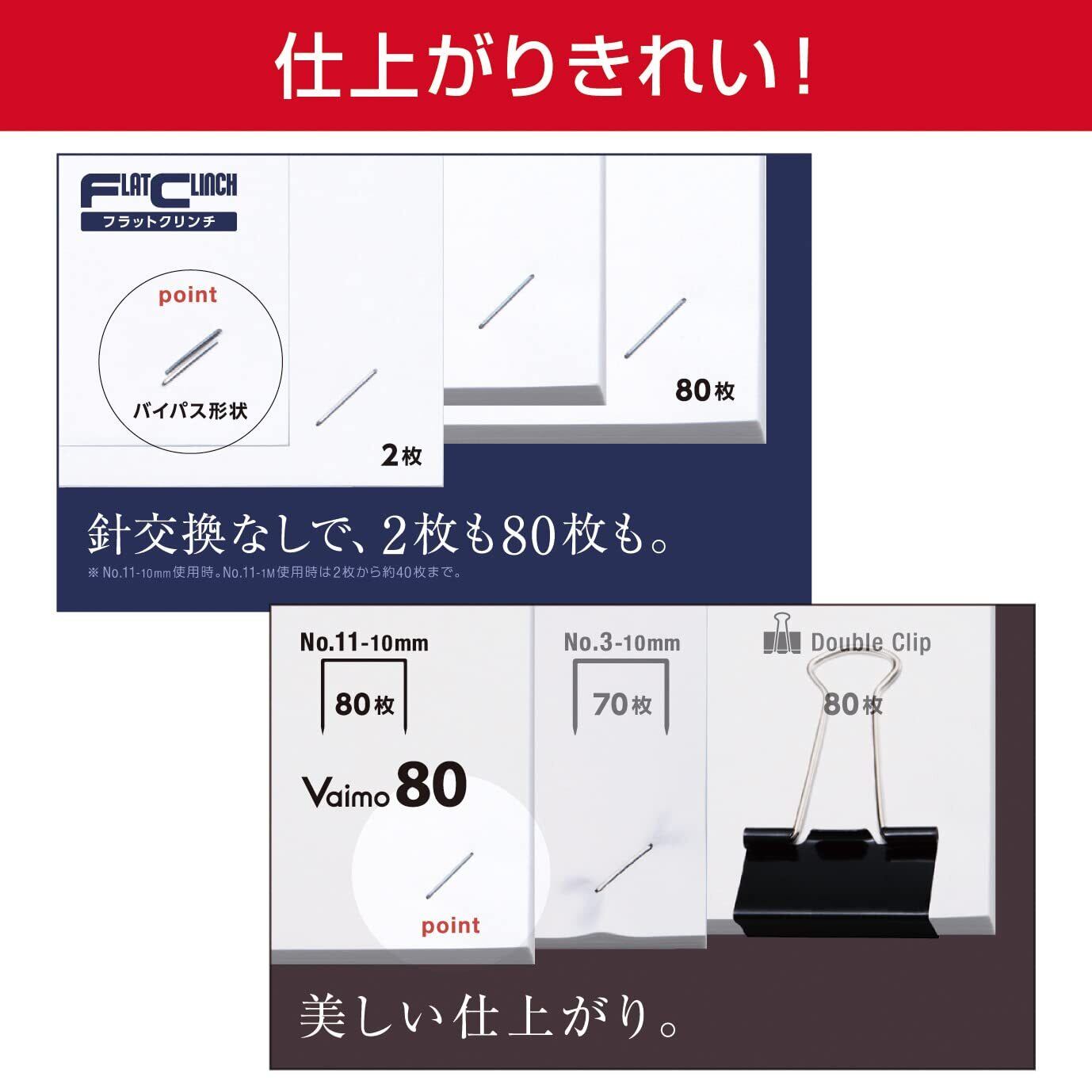 フラットクリンチでとじ裏もスッキリ。薄い枚数の時でも針が重ならない(バイバスフラットクリンチ)で、枚数に応じて針足の長さを変える必要がありません。針の細い(バイモ専用針)で仕上げもすっきり。フロントローディング方式(ボタンを押すだけで、マガジン部が前方にスライドして出てきます。あとは針を入れるだけの手軽さです)の採用により、針の装てんがラクラク。(奥行き調整レバー)により7.5mm~30mmまで針のとじ位置が調整できます。No.11-1M使用時は2枚から40枚までとじられます。再生材使用率69%。