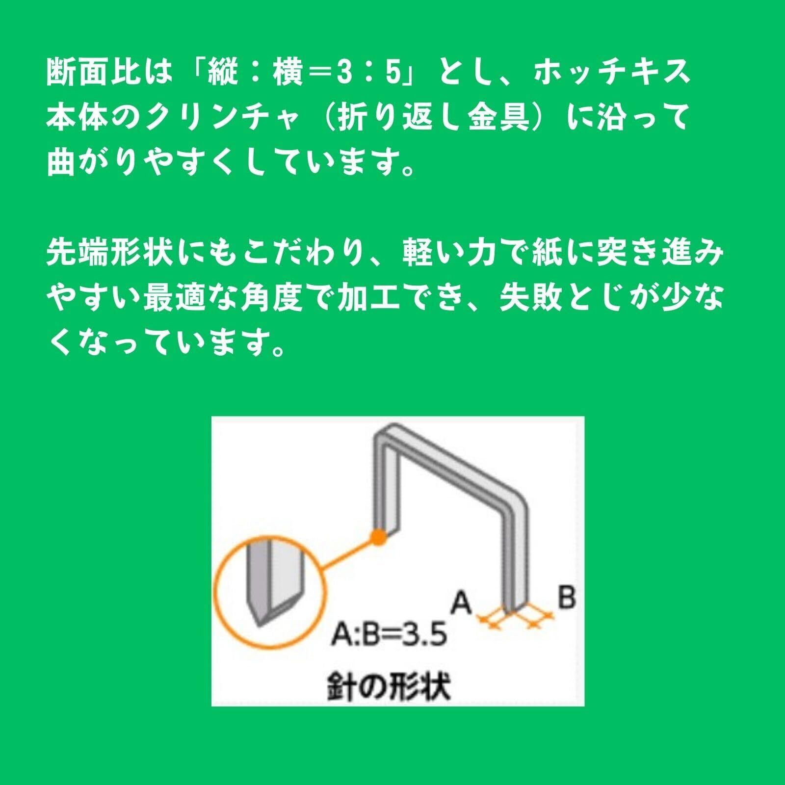 断面比は「縦:横=3:5」とし、ホッチキス本体のクリンチャに沿って曲がりやすくしている。