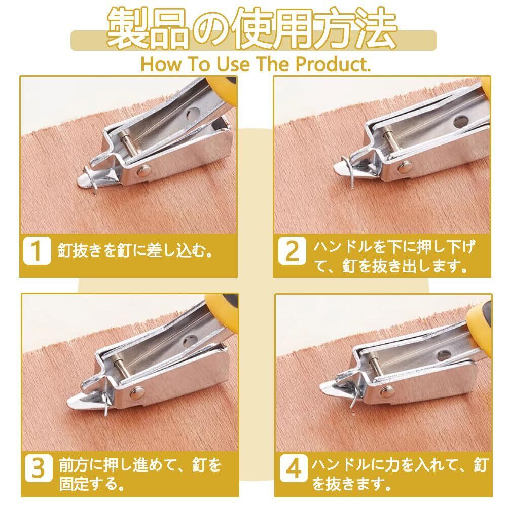【適用範囲と方法】 書籍、椅子、木工、DIY、工業など幅広い分野で使用できます。使用時は、まず釘抜きを釘に差し込み、ハンドルを下に押して釘を抜き出し、前方に押し進めて固定した後、再度力を入れて釘を抜きます。