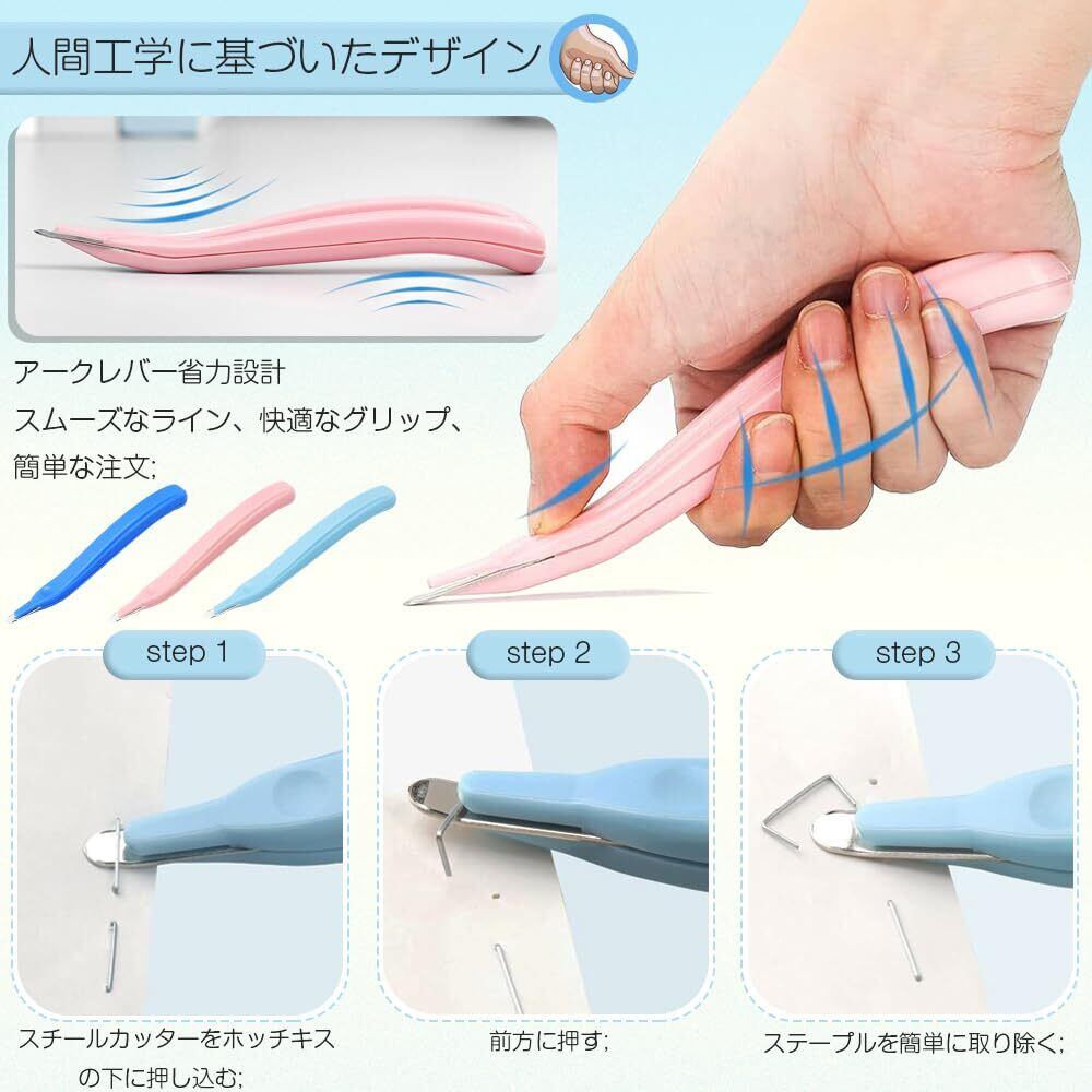 セット内容:ステープルリムーバー3本セット;カラー:ブルー*1pcs+淡いブルー*1pcs+ピンク*1pcs;ステンレススチールの先端は丈夫で錆びにくく、最大20枚の紙からステープルを取り除くことができ、簡単に曲がったり折れたりしません。