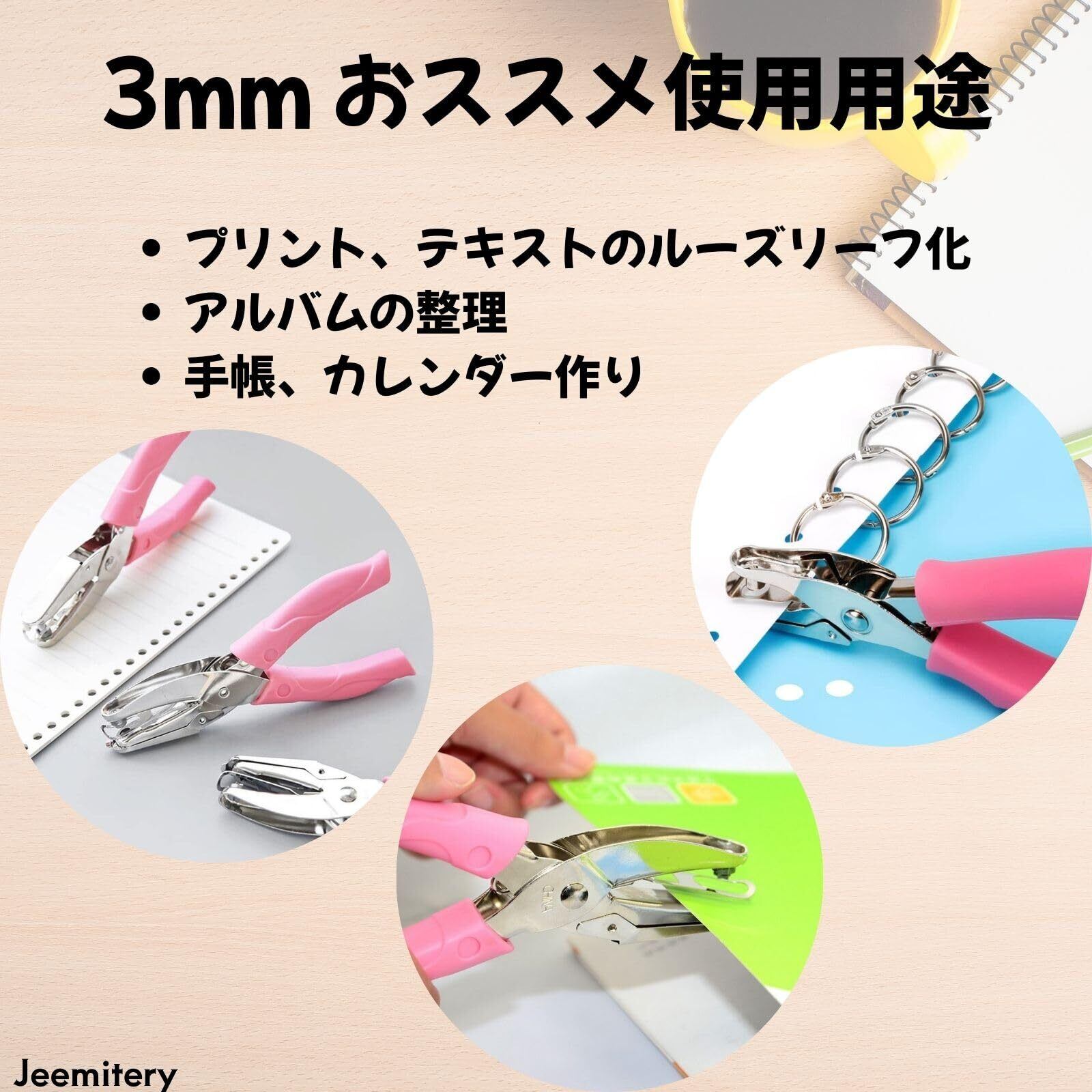用途に合わせて使える3種類:穴のサイズは6mmと3mmと1.5mmの3種類があります。用途に合わせて使い分けできます。手帳のカスタムやタグ作成、クラフト制作など細かい作業にも最適。ピアス台紙用にもおすすめです。