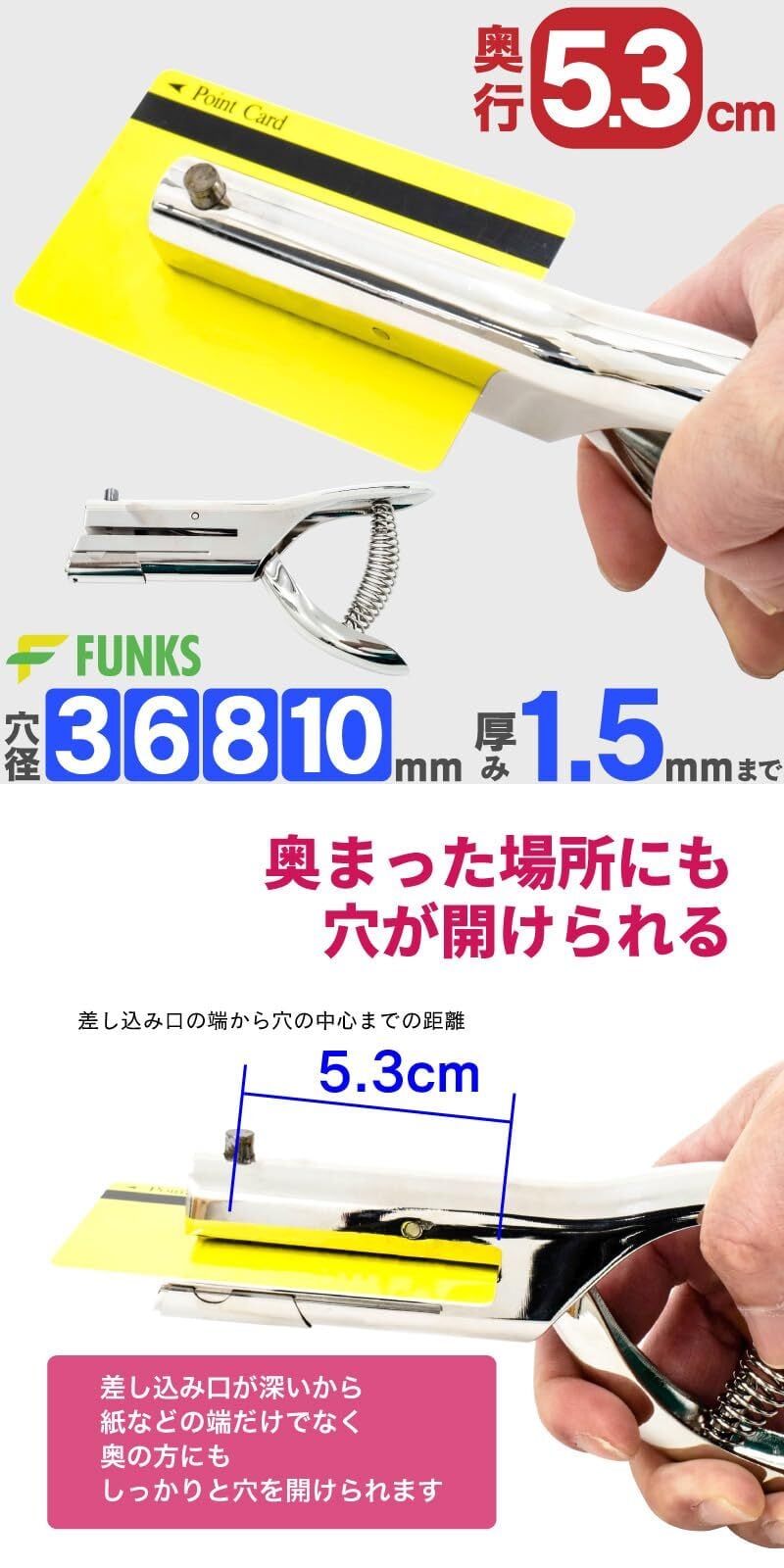 FUNKS 穴あけパンチ 1穴 単穴 穴径6mm 3mm 8mm 10mm 事務器 深穴 深さ53mm パンチ (3mm)