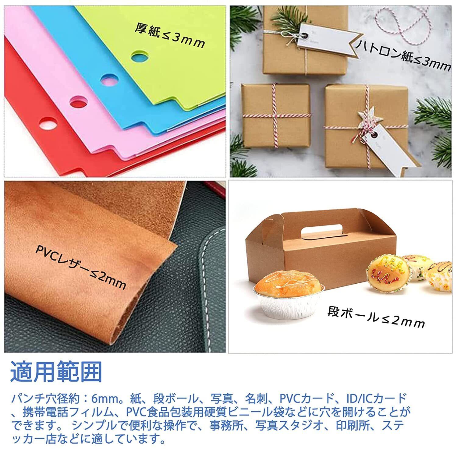 【適用範囲】:パンチ穴径(1穴)約:6mm。厚紙、台紙、写真、会員証、PVC・ID・ICカード、携帯電話フィルム、PVC食品包装用硬質ビニール袋などに穴を開けることができます。 シンプルで便利な操作で、事務所、写真スタジオ、印刷所、ステッカー店などに適しています。