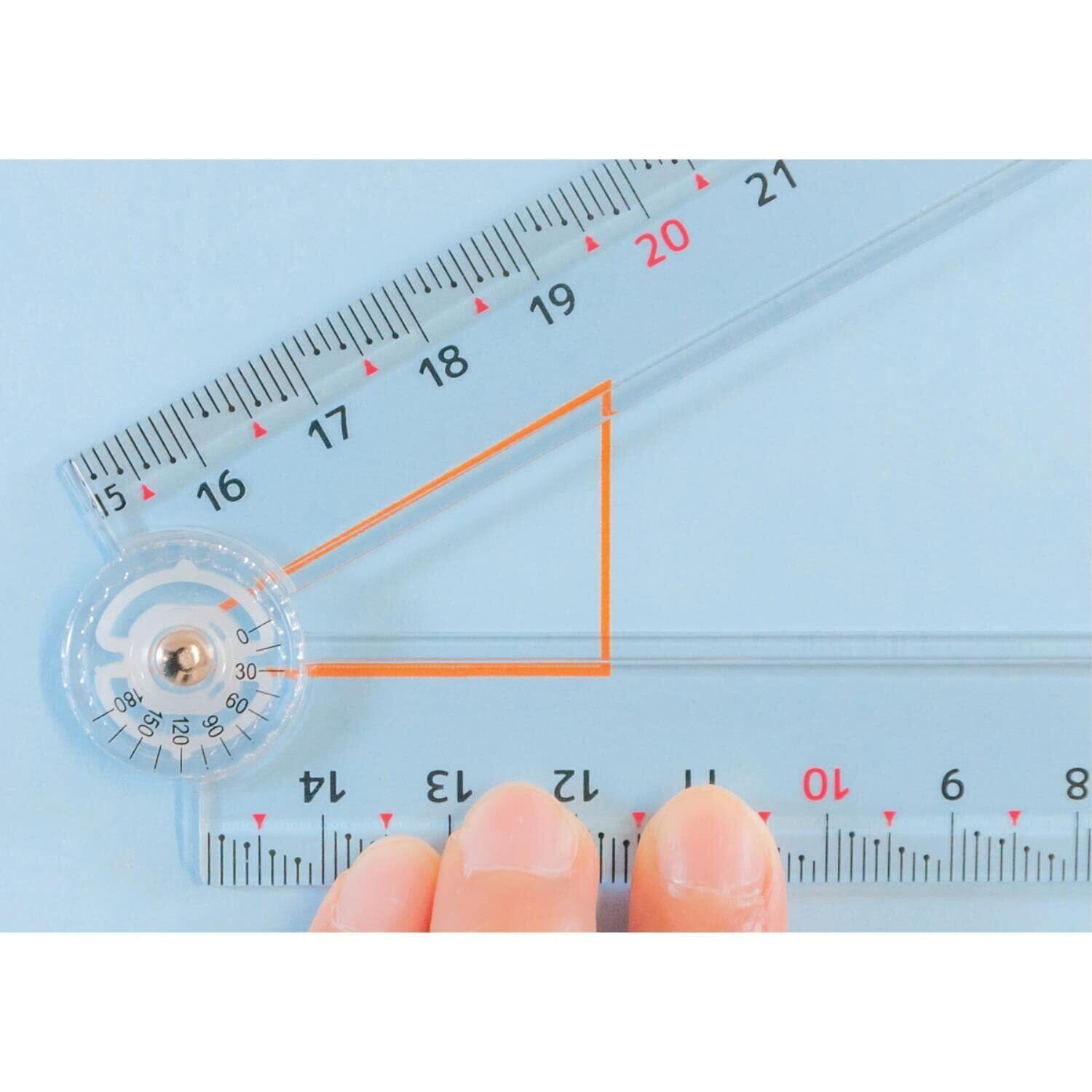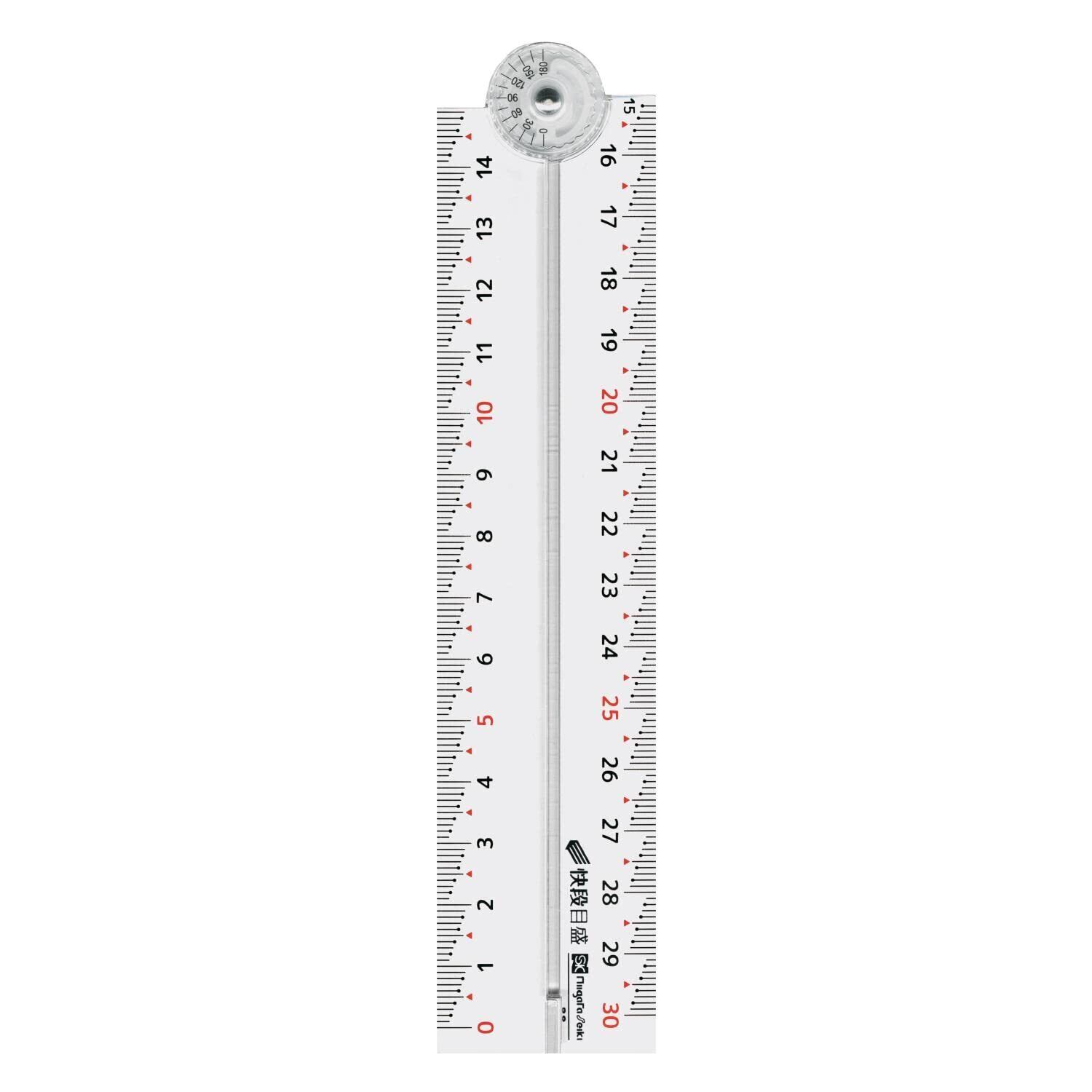 寸法測定や線引き作業に1mm単位の目盛が見やすい階段状目盛です。偶数飛びで数値を把握できる2mm点目盛です。数値を瞬時に把握できる連続追い数字です。折りたたみ式で筆箱に入るコンパクトサイズです。便利な分度器目盛付(0-180°)です。