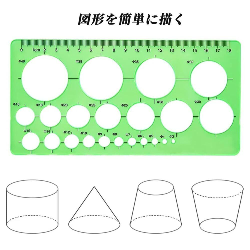 【高品質素材】幾何学図面テンプレートは高品質のプラスチック製です。厚みのあるデザインは丈夫で壊れにくく、長くお使いいただけます。丸いテンプレート定規の滑らかな表面は、快適な手触りを与え、透明な緑色はあなたの目を保護します。