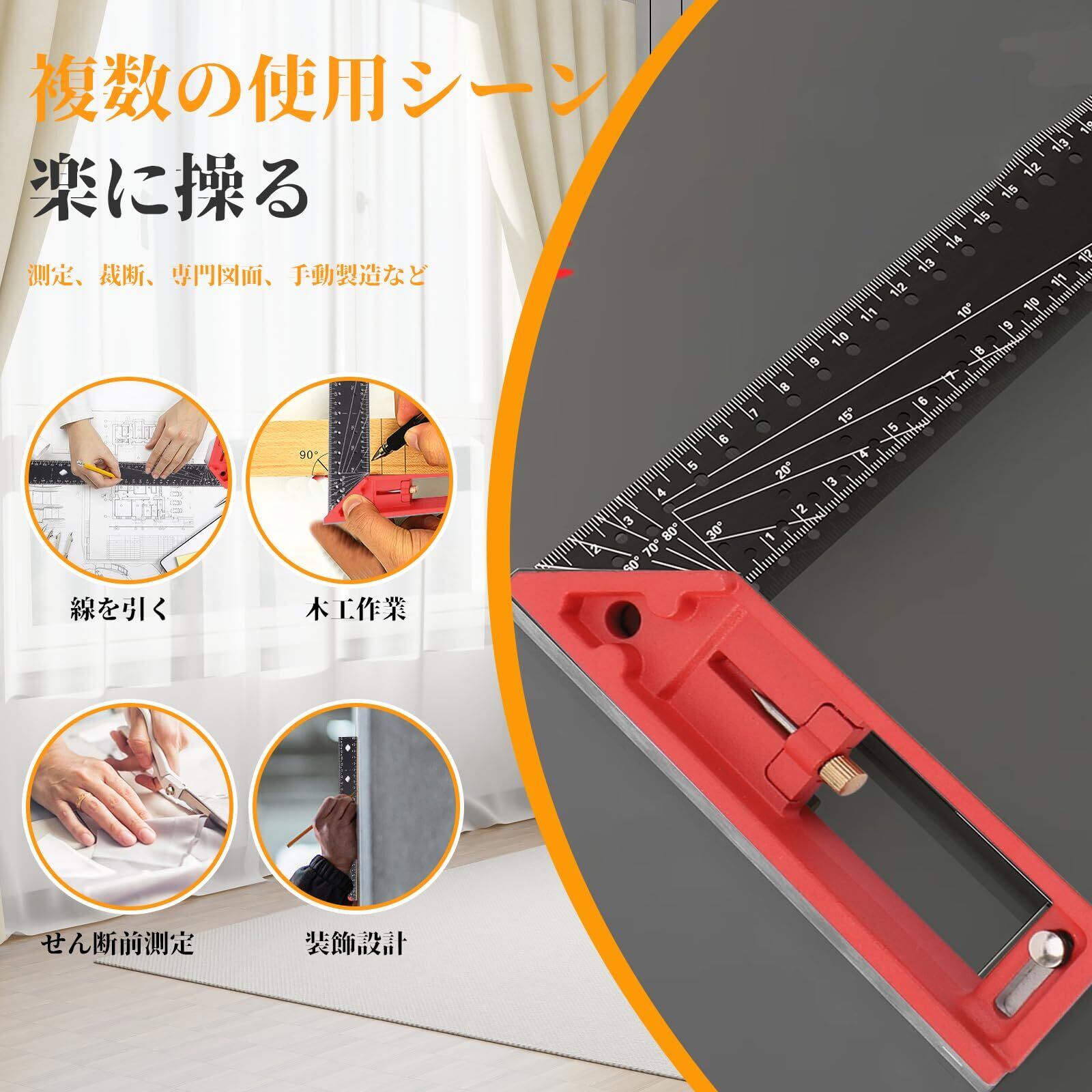 【高品質素材】カラー:ブラック/レッドから選択可能。角度測定ツールはアルミニウム合金を採用し、ベースが厚くなり、正確な角度、耐落下性、耐摩耗性、強い耐食性、耐久性があり、長期間使用しても曲がりません。レーザーレーザーフォント、ミリメートルの正確で明確、軽量でコンパクトな直定規なので持ち運びも簡単です。