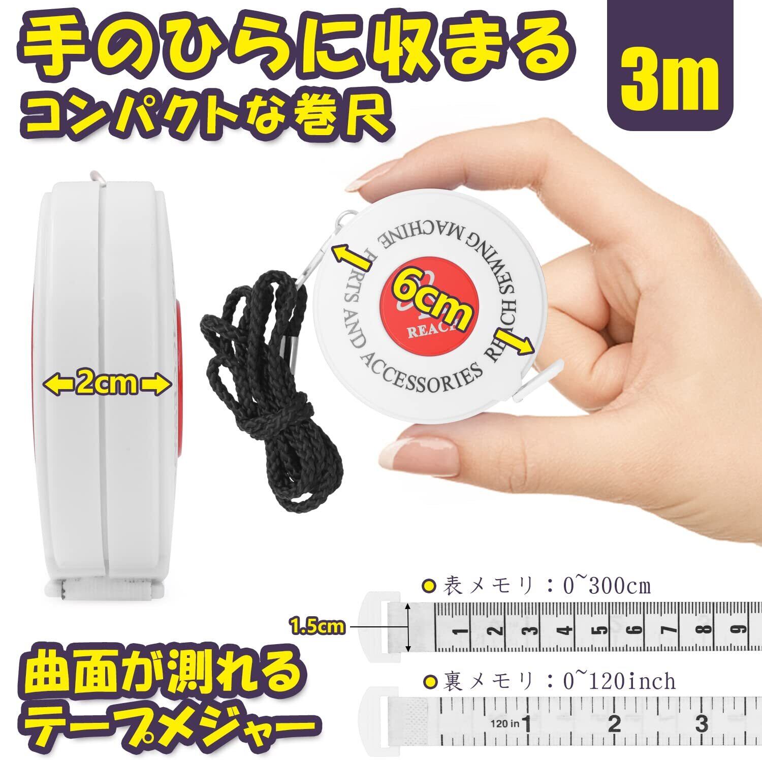 サイズ:テープ幅 * テープ長さ:1.5cm * 300cm 測定範囲:0~300cm/120inch 最小目盛:1mm