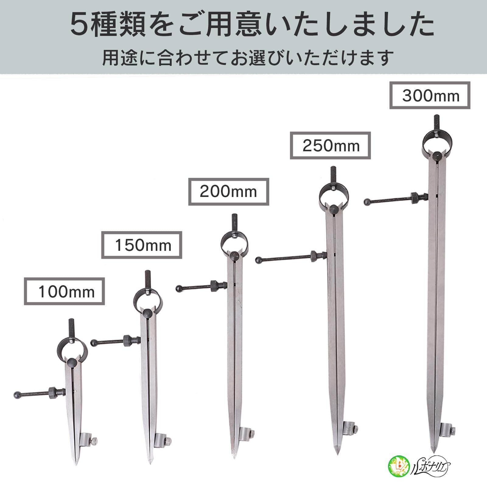 手にしっかりとフィットし、操作がしやすい鋼製コンパスです。100mm, 150mm, 200mm, 250mm, 300mmの5種類をご用意いたしましたので、ご用途に合わせてお選びください。