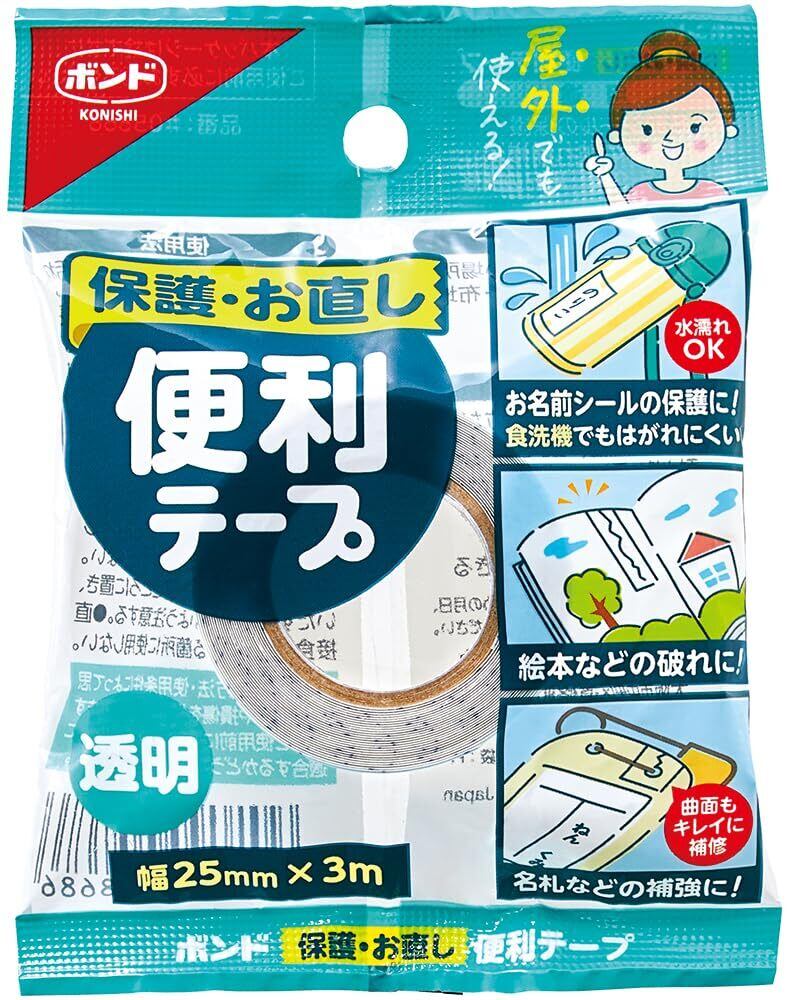 【新春セール】【パック売り】コニシ ボンド #05868 保護・お直し 便利テープ 25mm×3M 2巻入り 透明 お名前シール 絵本 破れ補修 レインカバー補修 名札 おもちゃ・ベビー用品の補修 紙工作の製作 補強 緊急補修 耐水性 耐熱性