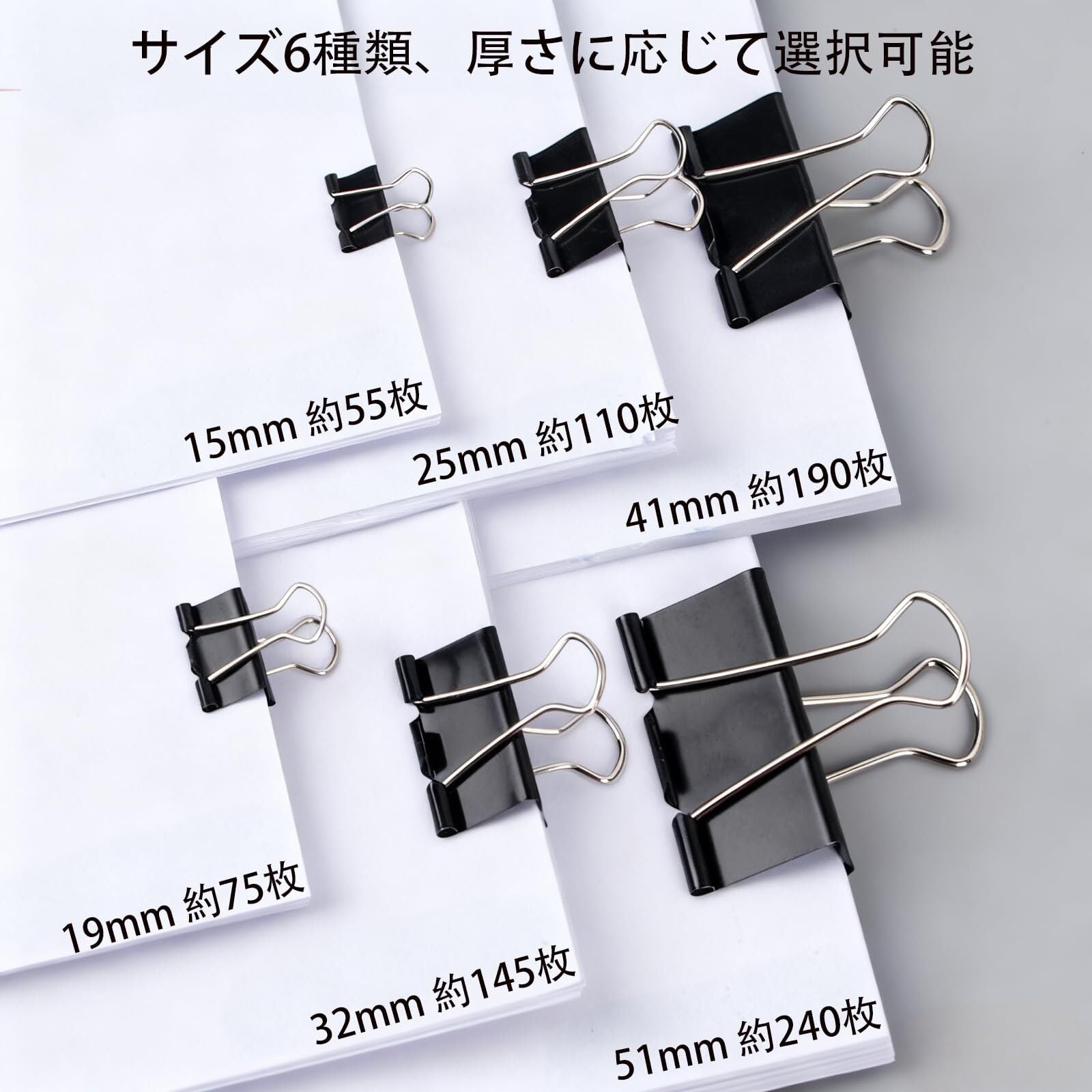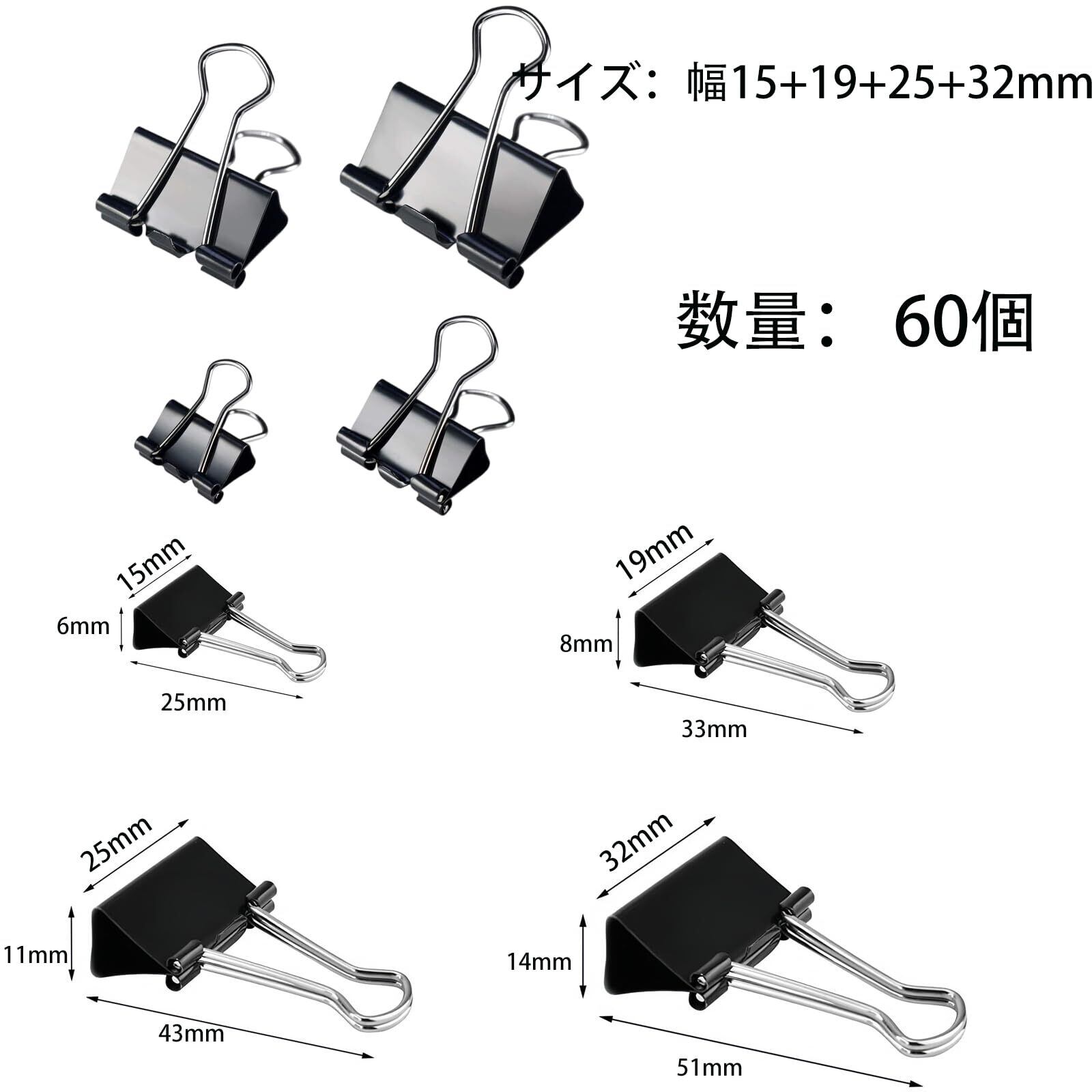 ダブルクリップ 中 15 19 25 32mm 60個入り 黒 金属製 ペーパークリップ 書類整理 オフィス 家庭用 業務用 文房具 お徳用 黒 袋止め (15+19+25+32 mm 60個)