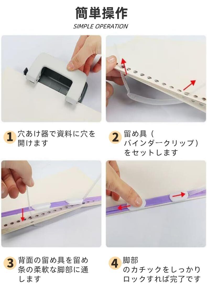 【工具不要!簡単操作】: 複雑な工具を必要とせず、誰でも手軽に使用可能。具体的には、①固定具を内側に押し込み②白色の副ロッドを外し③パンチで穴あけ④副ロッドを穿孔し主ロッドにセット⑤両側を押して固定する、という 4 ステップで簡単に文書を綴じることができます。外出先でもすぐに対応できるため、緊急時の文書整理にも最適です