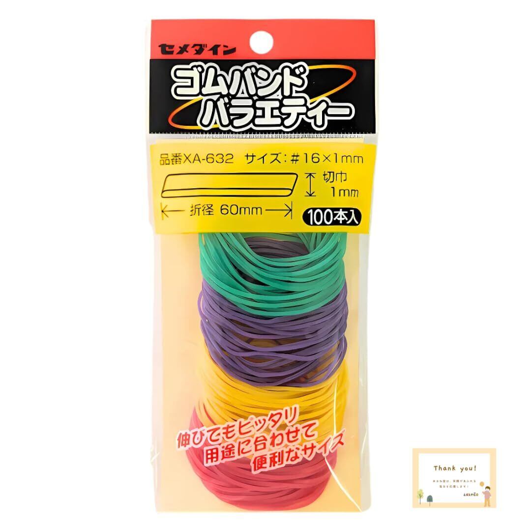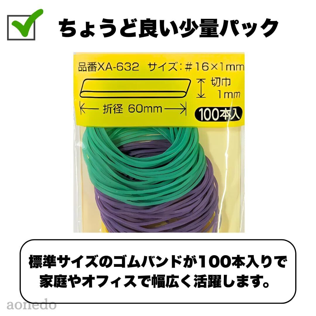 【ちょうど良い少量パック】標準サイズ(折径60mm・切巾1mm)のゴムバンドが100本入りで、家庭やオフィスで幅広く活躍します。