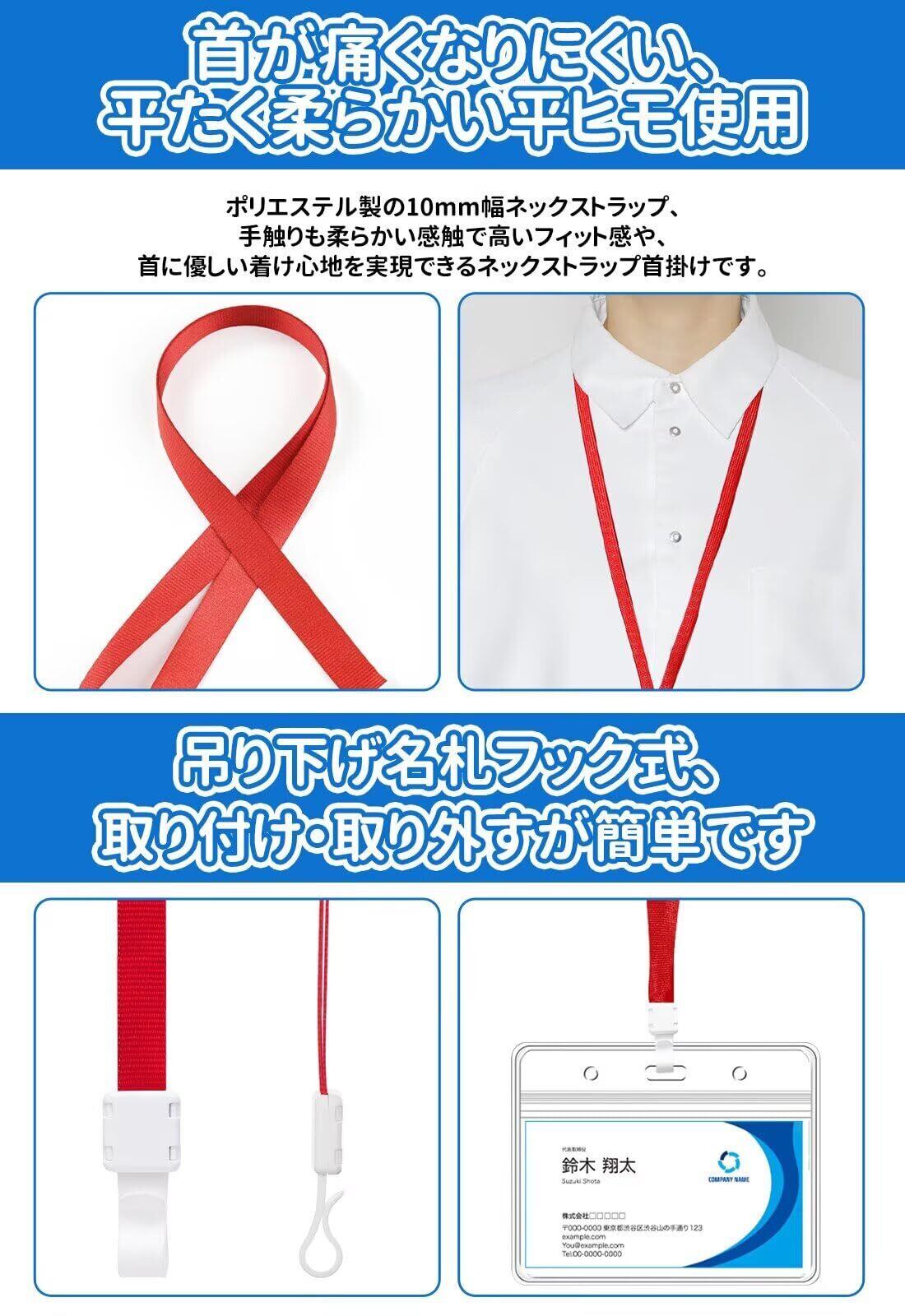 【首が痛くなりにくい、平たく柔らかい平ヒモ使用】ネックストラップ部分を、やわらかくて平らな平ヒモにすることで、首への負担を軽減しました。長時間付けても首が痛くないです。今まで首や肩が痛くて、ネックストラップの装着を悩んでいた方にもオススメです。①ネックストラップ全長約40CM ②製品サイズ約10x8.5cm ③適応カードサイズ約9.1x 5.5cm(日本標準サイズ完全対応)