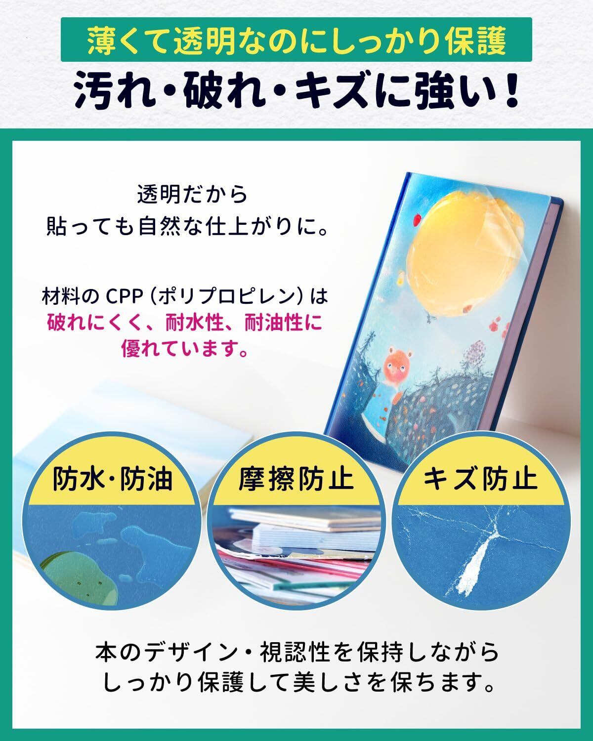 【破れにくく扱いやすいCPP素材】厚さ0.07mmのしなやかで柔らかい防水性のCPP素材を採用。ブックカバーとして本の形にしっかりフィットします。食品包装材にも使用されている無毒性のCPP素材は小さなお子様が扱うことにも配慮。