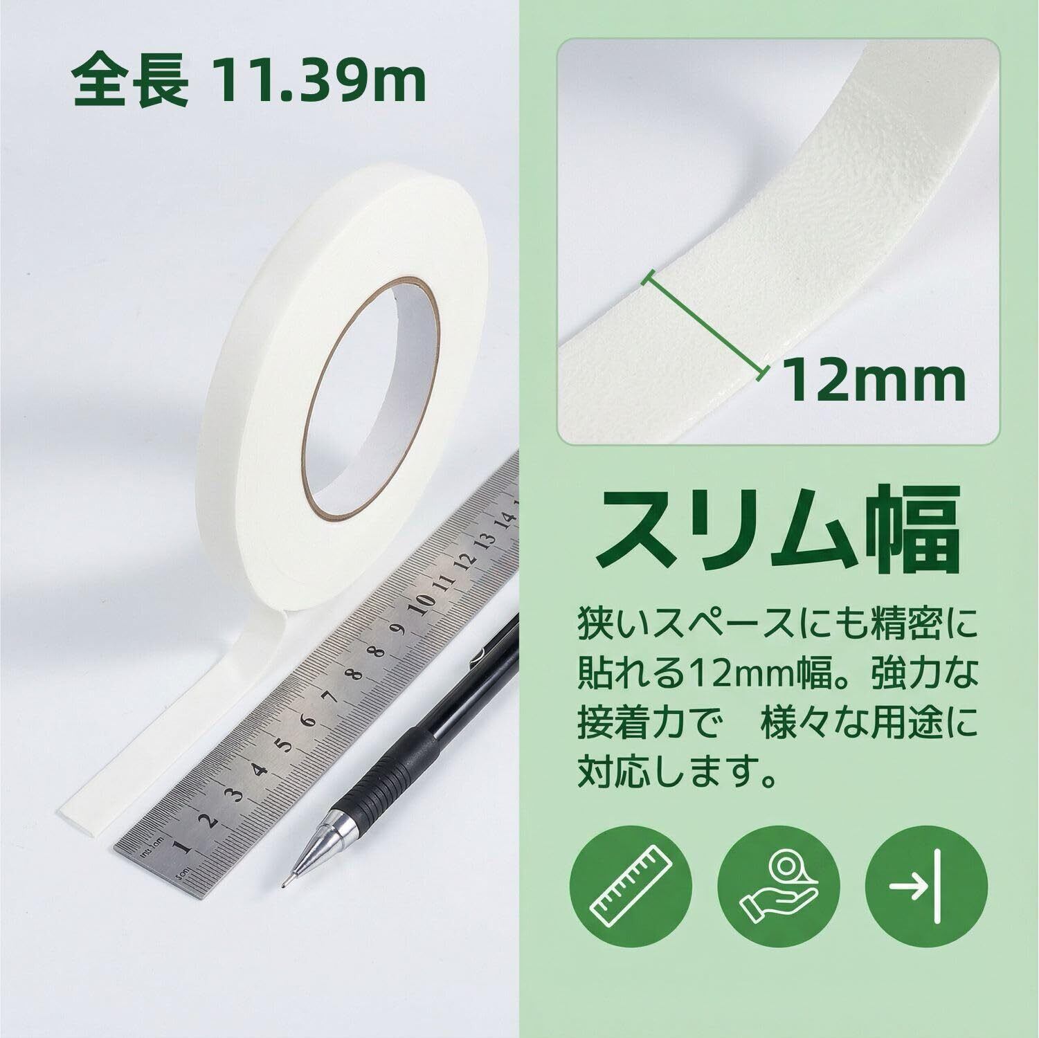 【商品仕様】この製品は幅12mm、長さ11.39mのスリムタイプのテープで、1巻の透明補修用テープが含まれています。詳細なサイズや性能については、製品の詳細説明をご確認ください。