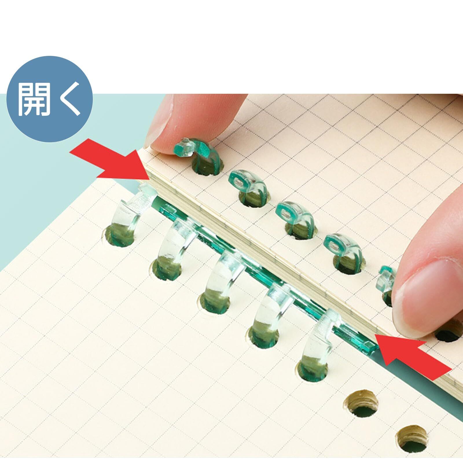 【構造】紙の5つの穴をスナップリングまたはコイル設計により固定し、着脱可能なステープル構造を形成する。