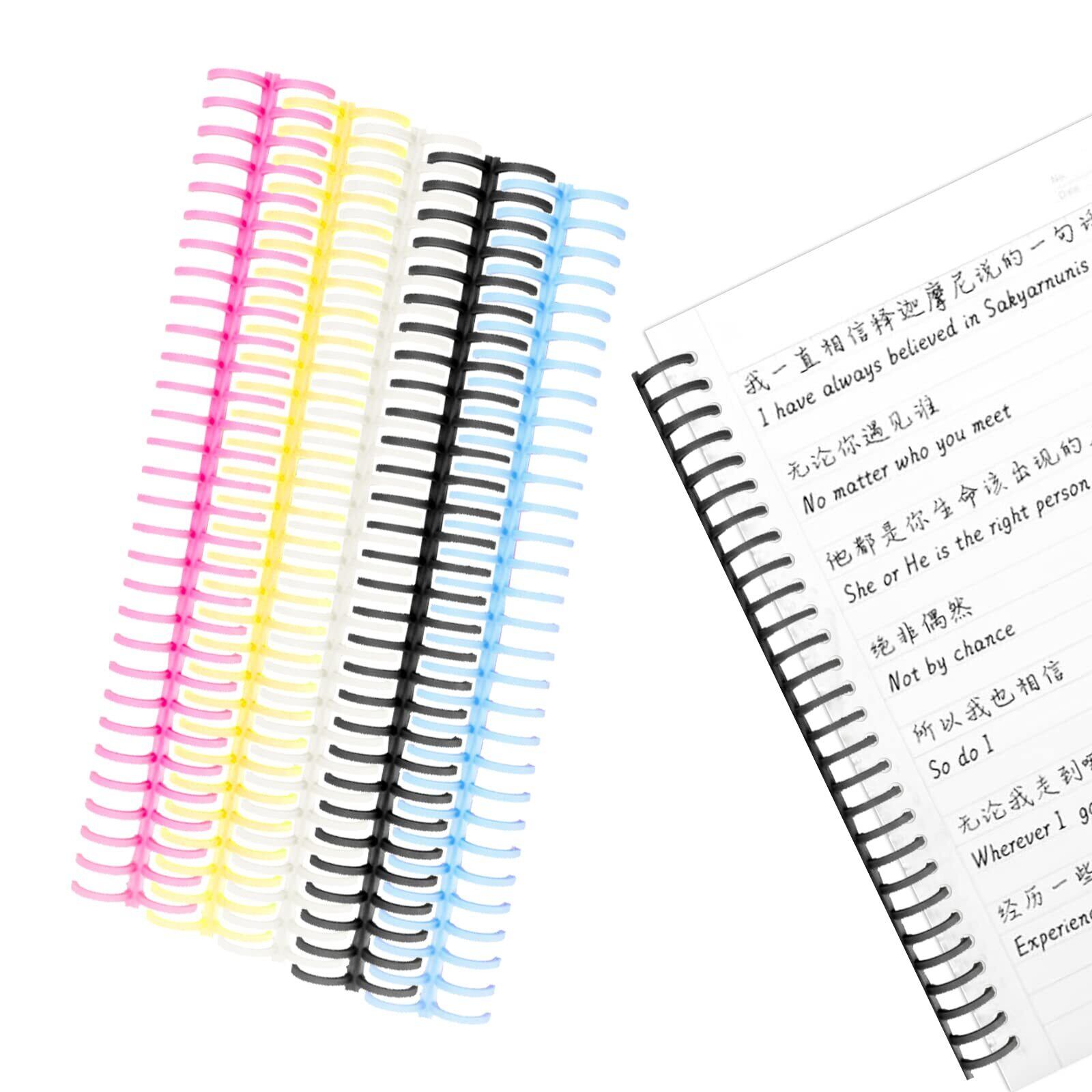 【商品仕様】:素材:プラスチック製、適用対象:A4/30穴、B5/26穴、A5/20穴(長さが自由にカット可能)、製本容量:130枚/本、セット内容:計20本(黒*4+白*4+ピンク*4+黄*4+ブルー*4)