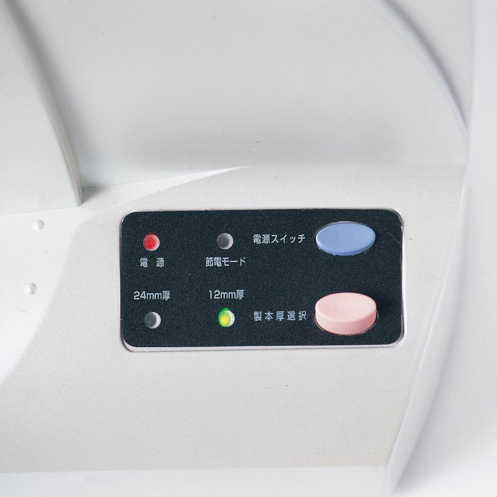◆品名:サーマンバインド 50T◆品番:GTT0050◆サイズ:W380xD175xH185mm◆質量:1.53kg◆電源:AC100V, 50/60Hz◆消費電力:55W◆最大加工幅:315mm(A4長辺サイズ)◆最大加工厚:最大24mm厚まで(コピー用紙換算最大250枚程度)◆製本時間:約35~45秒